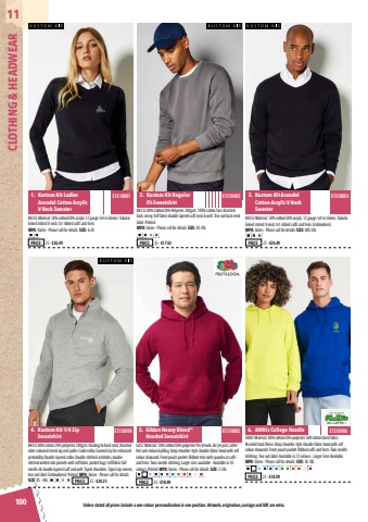 Unless stated all prices include a one colour personalisation in one position. Artwork, origination, carriage and VAT are extra. 100 CLOTHING & HEADWEAR11KK353 Material: 50% cotton/50% acrylic.12 gauge. Set in sleeves. Tubular linked mitred V neck.1x1 ribbed cuffs and hem. MPA: Varies - Please call for details. SIZE: 6-20KK332 80% Cotton/20% Polyester. 280gsm. 100% cotton face. Brushed back Jersey. Self fabric double layered cuff, neck & welt. Tear out back neck label. Printed.MPA: Varies - Please call for details. SIZE: XS-2XLKK352 Material: 50% cotton/50% acrylic. 12 gauge. Set in sleeves. Tubular linked mitred V neck.1x1 ribbed cuffs and hem. Embroidered.MPA: Varies - Please call for details. SIZE: XXS-3XL1. Kustom Kit Ladies Arundel Cotton Acrylic V Neck Sweater2. Kustom Kit Regular Fit Sweatshirt3. Kustom Kit Arundel Cotton Acrylic V Neck SweaterPRICE: 25 - %u00a326.49 PRICE: 25 - %u00a317.63 PRICE: 25 - %u00a326.49E1510001 E1510002E159705E1510003GD57 Material: 50% cotton/50% polyester. Pre-shrunk. Air jet yarn, softer feel and reduced pilling. Drop shoulder style. Double fabric hood with self colour drawcord. Front pouch pocket. Ribbed trim with spandex at cuffs and hem. Twin needle stitching. Larger sizes available - Available in 45 colours. Printed. MPA: Varies - Please call for details. SIZE: S-2XLKK335 80% cotton 20% polyester. 280gsm. Binding to back neck. Brushed silver coloured metal zip and puller. Cadet collar. Covered zip for enhanced printability. Double layered collar. Double stitched armholes, double stitched welted side pockets with self-fabric pocket bags. Self-fabric full needle rib double layered cuff and welt. Taped shoulders. Taped zip reverse, tear out label. Embroidered. Printed. MPA: Varies - Please call for details.SIZE: XS - 4XL5. Gildan Heavy Blend%u2122Hooded Sweatshirt4. Kustom Kit 1/4 Zip SweatshirtPRICE: PRICE: 25 - %u00a318.49 25 - %u00a324.25JH001 Material: 80% cotton/20% polyester. Soft cotton faced fabric. Brushed back fleece. Drop shoulder style. Double fabric hood with self colour drawcord. Front pouch pocket. Ribbed cuffs and hem. Twin needle stitching. Tear out label. Available in 72 colours - Larger Sizes Available. MPA: Varies - Please call for details. SIZE: XS-3XL6. AWDis College HoodiePRICE: 25 - %u00a318.49E1510004 E1510005 E1510006