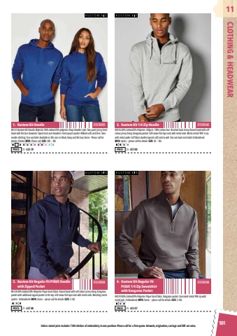 101CLOTHING & HEADWEAR11KK333 Kustom Kit Hoodie. Material: 80% cotton/20% polyester. Drop shoulder style. Two panel jersey lined hood with flat lace drawcord. Taped neck and shoulders. Front pouch pocket. Ribbed cuffs and hem. Twin needle stitching. Tear out label. Available in 4XL sizes in Black, Navy and Dk Grey. Varies - Please call for details. Printed. MPA: Please call. SIZE: XXS %u2013 4XLKK338 80% Cotton/20% Polyester. Pique faced fabric. Raised hood with self colour jersey lining. Kangaroo pocket with additional zipped pocket at the top. Self colour flat tape cord with metal ends. Matching metal eyelets. Embroidered. MPA: Varies %u2013 please call for details. SIZE: S-3XLKK336 80% Cotton/20% Polyester. 280gsm. 100% cotton face. Brushed back Jersey. Raised hood with self colour jersey lining. Kangaroo pocket. Self colour flat tape cord with metal ends. Metal central YKK %u00bc zip with metal puller. Self fabric double layered cuff, neck & welt. Tear out back neck label. Embroidered.MPA: Varies %u2013 please call for details. SIZE: XS %u2013 3XL.KK339 80% Cotton/20% Polyester. Pique faced fabric. Kangaroo pocket. Concealed metal YKK zip with metal pull. Embroidered. MPA: Varies %u2013 please call for details. SIZE: S-3XL1. Kustom Kit Hoodie3. Kustom Kit Regular Fit PIQUE Hoodie with Zipped Pocket2. Kustom Kit 1/4 Zip Hoodie4. Kustom Kit Regular Fit PIQUE 1/4 Zip Sweatshirt with Kangaroo PocketPRICE: 25 - %u00a322.79PRICE: 25 - %u00a327.00PRICE: 25 - %u00a327.00PRICE: 25 - %u00a325.97E1510101E1510103E1510102E1510104Unless stated price includes 7500 stitches of embroidery in one position. Please call for a firm quote. Artwork, origination, carriage and VAT are extra.
