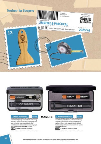 110Torches %u00b7 Ice Scrapers## UK TRACKING ##UK PRIORITYRATE APPROVEDID: PROMO2025/2026(PROMOMERCH DEPT.)PLEASE HANDLE WITH CARE - OPEN CAREFULLYLIFESTYLE & PRACTICAL2025/26Code: 120866-31060918-2613Unless stated all prices include a one colour personalisation in one position. Artwork, origination, carriage and VAT are extra. 110Incandescent torch with a focussing spot to flood beam. Manufactured in the USA from high strength aluminium. Durable anodised casing; shock, water & corrosion resistant. Compact at 8mm in length - ideal for use on a key chain. Includes a spare bulb in the tail cap. Individually boxed in a black presentation case with battery, lanyard strap & life-time guarantee. Engraved. MPA: 35 x 7mmIncandescent torch with a focussing spot to flood beam. Manufactured in the USA from high strength aluminium. Durable anodised casing; shock, water & corrosion resistant. Includes a spare bulb in the tail cap. Sized at 147mm in length; compact but powerful. Individually boxed in a black presentation case with batteries & life-time guarantee. Engraved. MPA: 56 x 10mm1. Maglite Solitaire Torch 2. Mini Maglite AA TorchPRICE: 50 - %u00a314.96 / 100 - %u00a313.74 / 250 - %u00a313.12 PRICE: 50 - %u00a325.06 / 100 - %u00a323.66 / 250 - %u00a322.65E1511001 E1511002