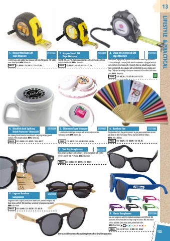 Due to possible currency fluctuations please call us for a firm quotation.113LIFESTYLE & PRACTICAL13This bamboo fan is the perfect product to give you a quick breeze to cool you down in style. Full Colour Print as standard. MOQ of 100pcs. MPA: 210 x 380mm6. Bamboo FanPRICE: 100 - %u00a34.21 / 250 - %u00a33.09 / 500 - %u00a31.78E1511306 3m/10ft ABS and PVC plastic measuring tape with carry handle, belt clip and side lock button. MPA: 38mm dia.2. Harper Small 3M Tape MeasurePRICE: 50 - %u00a33.84 / 100 - %u00a33.46 / 250 - %u00a33.18E15113025 metre heavy duty rubber tape measure with clip. ABS plastic. TRP rubber cover. Steel blade. MPA: 42mm dia.1. Harper Medium 5M Tape MeasurePRICE: 50 - %u00a34.80 / 100 - %u00a34.31 / 250 - %u00a33.84E1511301Anti Spiking Drink Protector reusable with a key ring carrying pouch. Contains 10% reusable plastic. MPA: 50mm dia.4. BlockTek Anti Spiking Drink Protector- ReusablePRICE: 200 - %u00a33.42 / 500 - %u00a32.97 / 1000 - %u00a32.77E1511304Sunglasses with a stylish, round, matt black frame, bamboo temples, and black lenses with UV 400 protection (according to European standards). MPA: 40 x 6mm8. Laguna Bamboo SunglassesPRICE: 100 - %u00a33.99 / 250 - %u00a33.76 / 500 - %u00a33.58E1511308Professional, high-quality tape measure with hard steel strap (bandwidth 1.9 cm and length 5 metres), indication in centimetres. Equipped with an extra reinforced end hook with 2 magnets. Non-slip robust housing made from recycled ABS. Also supplied with a metal belt clip and a handy wrist loop. Calibrated according to European standards. RCS-certified. Full colour print. MPA: 39mm dia.3. Clark RCS Recycled 5M Tape MeasurePRICE: 100 - %u00a35.74 / 250 - %u00a35.49 / 500 - %u00a35.23E15113031.5 metre retractable tape measure with inches and cms scales. Full colour print. MPA: 38mm dia.5. Slimmers Tape MeasurePRICE: 250 - %u00a30.95 / 500 - %u00a30.90 / 1000 - %u00a30.86E1511305Retro design sunglasses with category 3 lenses. Compliant with EN ISO 12312-1 and UV 400. PC Plastic. MPA: 70 x 7mm7. Sun Ray SunglassesPRICE: 50 - %u00a31.36 / 100 - %u00a31.14 / 250 - %u00a31.04E1511307Low cost sunglasses with CE standard compliance and 100% UV 400 protection lenses. Available in a large range of colours. Mix and match service available. Spot colour print, printed both sides. MPA: 45 x 5mm9. Fiesta SunglassesPRICE: 100 - %u00a32.37 / 250 - %u00a31.84 / 500 - %u00a31.67E1511309