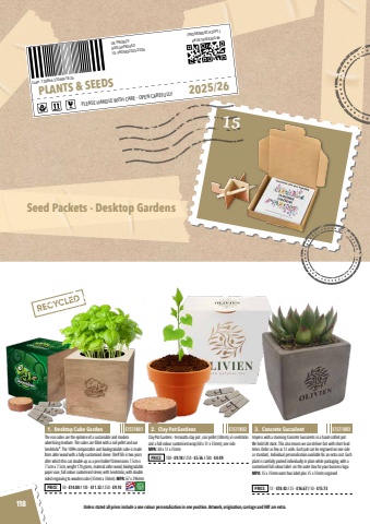Unless stated all prices include a one colour personalisation in one position. Artwork, origination, carriage and VAT are extra.Seed Packets %u00b7 Desktop Gardens## UK TRACKING ##UK PRIORITYRATE APPROVEDID: PROMO2025/2026(PROMOMERCH DEPT.)PLEASE HANDLE WITH CARE - OPEN CAREFULLYPLANTS & SEEDS2025/26Code: 120866-31060918-2615The eco cubes are the epitome of a sustainable and modern advertising medium. The cubes are filled with a soil pellet and our Seedsticks%u00ae. The 100% compostable and biodegradable cube is made from alder wood with a fully customised sleeve. Shelf life is two years after which this can double up as a pen holder! Dimensions 7.5cm x 7.5cm x 7.5cm, weight 170 grams, material alder wood, biodegradable paper vase, full colour customised sleeve, with Seedsticks, with double sided engraving to wooden cube (35mm x 35mm). MPA: 67 x 296mm1. Desktop Cube GardenPRICE: 50 - %u00a314.00 / 100 - %u00a311.32 / 250 - %u00a39.10E1511801Clay Pot Gardens - terracotta clay pot , coir pellet (30mm), x5 seedsticks and a full colour customised wrap (60 x 51 x 35mm), one side. MPA: 60 x 51 x 35mmImpress with a stunning Concrete Succulents in a hand-crafted pot. We hold UK stock. This also means we can deliver fast with short lead times. Order as few as 12 units. Each pot can be engraved on one side as standard,. Individual personalisation available for an extra cost. Each plant is carefully packed individually in plain white packaging, with a customised full colour label on the outer box for your business logo. MPA: 35 x 35mm outer box label plus 35 x 35mm engraved2. Clay Pot Gardens 3. Concrete SucculentPRICE: 100 - %u00a39.18 / 250 - %u00a35.56 / 500 - %u00a34.49PRICE: 12 - %u00a318.42 / 25 - %u00a316.67 / 50 - %u00a315.73E1511802 E1511803118