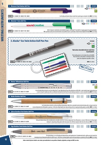 Unless stated all prices include a one colour personalisation in one position. Artwork, origination, carriage and VAT are extra. 12WRITING INSTRUMENTS1E151204E151205E151206E151207An eco-friendly ball pen based on our best-selling Electra%u00ae range. Manufactured from 40% wheatstraw and 60% ABS, a more durable, longer lasting plastic that is easier to recycle. A stylish pen with eco-credentials that would lend itself well to brands looking to promote in a more sustainable way. MPA: 40 x 20mmEco-friendly ball pen ideal for eco-focused gifting and promotions. Made from sustainable hand-machined bamboo with an elegant metal clip. German Dokumental ink refill provides a generous 1,500 metre writing length. Spot colour printing and laser engraving branding options available. MPA: 45 x 20mmSleek push-button ball pen with a bamboo barrel and stylish metal trim. A German Dokumental%u00ae ink refill promises a massive 1000 metres of writing length, making for a long-lasting writing option which only requires the refill to be replaced rather than the entire pen. MPA: 35 x 25mmThe Ergo Bamboo is an eco-friendly, push-button ball pen with bamboo barrel. Complemented with a stylish gun metal coated clip. Containing German Dokumental jumbo ink refill for up to 1,500 metres of writing length to add to the long lasting eco-credentials of this pen. MPA: 40 x 20mm4. Electra%u00ae Wheatstraw Ball Pen5. Rodeo Bamboo Ball Pen6. Sylvan Bamboo Push Button Ball Pen7. Ergo Bamboo Push Button Ball PenPRICE: 100 - %u00a31.19 / 250 - %u00a30.65 / 500 - %u00a30.47PRICE: 100 - %u00a30.93 / 250 - %u00a30.62 / 500 - %u00a30.47 PRICE: 100 - %u00a31.48 / 250 - %u00a30.94 / 500 - %u00a30.76 PRICE: 100 - %u00a31.19 / 250 - %u00a30.72 / 500 - %u00a30.55 E151201E151202Eco friendly push-button ball pen made from recycled paper and plastic trim. MPA: 50 x 25mmWith its two-piece construction and uncluttered elegance, the Absolute%u00ae Extra Ball Pen is hugely popular for general promotions. With a generous print area on the barrel that can be printed in up to 5 spot colours, Ultra HD and in Digital Full Colour MPA: 50 x 25mm1. Biosense Push Button Ball Pen2. Absolute%u00ae Extra Ball PenPRICE: 250 - %u00a30.48 / 500 - %u00a30.30 / 1000 - %u00a30.28 PRICE: 250 - %u00a30.53 / 500 - %u00a30.37 / 1000 - %u00a30.32 PRICE: 250 - %u00a31.17 / 500 - %u00a30.99 / 1000 - %u00a30.91E151203Twist-action retractable ball pen made from recycled plastic.This recycling process is set to reduce the use of landfills. Please note that as this product is made from recycled plastic, the components may differ in colour.MPA: 45 x 20mm3. Alaska%u00ae Eco Twist Action Ball Pen PenPRICE: 250 - %u00a30.69 / 500 - %u00a30.52 / 1000 - %u00a30.42