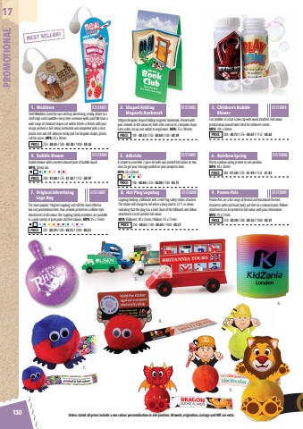 Unless stated all prices include a one colour personalisation in one position. Artwork, origination, carriage and VAT are extra. 130PROMOTIONAL17Shelf Wobblers. Great for eye-catching advertising, simply attach to a shelf edge and it wobbles every time someone walks past! We have a wide range of standard shapes cut within 85mm x 85mm with your design printed in full colour, laminated and completed with a clear plastic arm and self adhesive sticky pad. For bespoke shapes, please call for prices. MPA: 85 x 85mm380gsm Bespoke shaped folding magnetic bookmark. Printed with your artwork in full colour on both sides and cut to a bespoke shape. Extra cutter set up cost added to origination. MPA: 55 x 185mmFun bubbles in a tub. Screw cap with wand attached. Full colour printed wrap around label. Ideal for children%u2019s events.MPA: 105 x 50mmPromo-Pals are a fun range of Animal and Vocational themed characters with card head, body and feet on a coloured pom. Ribbon attachment can be printed in full colour with your information.MPA: 95 x 17mm1. Wobblers 2. Shaped Folding Magnetic Bookmark3. Children%u2019s Bubble Blower9. Promo-PalsPRICE: 250 - %u00a30.43 / 500 - %u00a30.38 / 1000 - %u00a30.36PRICE: 100 - %u00a30.53 / 250 - %u00a30.60 / 500 - %u00a30.39 PRICE: 288 - %u00a30.72 / 576 - %u00a30.67 / 1152 - %u00a30.62PRICE: 250 - %u00a30.38 / 500 - %u00a30.33 / 1000 - %u00a30.31E1513001 E1513002 E1513003E1513009Logobug holding a billboard with a Hot Plug safety sticker attached. The sticker will change to red when a plug reaches 52%u00b0C or above, indicating that the plug has a fault. Back of the billboard and ribbon attachment can be printed full colour.MPA: Billboard: 40 x 25mm / Ribbon: 95 x 17mm8. Hot Plug LogobugPRICE: 250 - %u00a30.65 / 500 - %u00a30.60 / 1000 - %u00a30.57E1513008Plastic rainbow spring printed in one position.MPA: 40 x 50mm6. Rainbow SpringPRICE: 288 - %u00a31.58 / 576 - %u00a31.49 / 1152 - %u00a31.43E15130067.6.5.8.4.9.A simple to assemble 7 piece kit with sign printed full colour on two sides, to get your message parked on your prospects desk.MPA: 60 x 60mm5. AdbricksPRICE: 100 - %u00a30.86 / 250 - %u00a30.80 / 500 - %u00a30.75E1513005Bubble blower with assorted coloured pots of bubble liquid.MPA: 45mm dia4. Bubble BlowerPRICE: 288 - %u00a31.08 / 576 - %u00a31.02 / 1152 - %u00a30.97E1513004The most popular %u2018Original Logobug%u2019 and still the most effective low cost promotional item. Your artwork printed on a ribbon style attachment in full colour. The Logobug family members are available in a wide variety of pom pom and feet colours. MPA: 95 x 17mm7. Original Advertising Logo BugPRICE: 250 - %u00a30.29 / 500 - %u00a30.25 / 1000 - %u00a30.23E1513007