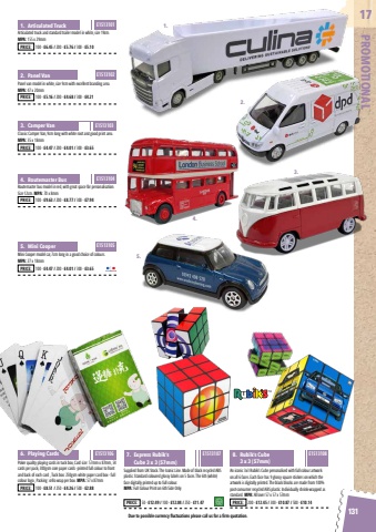 Due to possible currency fluctuations please call us for a firm quotation.131PROMOTIONAL17Articulated truck and standard trailer model in white, size 19cm.MPA: 155 x 29mmSupplied from UK Stock. The Iconic Line. Made of black recycled ABS plastic. Standard coloured glossy labels on 5 faces. The 6th (white) face digitally printed up to full colour.MPA: Full Colour Print on 6th Side OnlyPanel van model in white, size 9cm with excellent branding area.MPA: 47 x 20mmAn iconic 3x3 Rubik%u2019s Cube personalised with full colour artwork on all 6 faces. Each face has 9 glossy square stickers on which the artwork is digitally printed. The black blocks are made from 100% post-consumer recycled ABS plastic. Individually shrink-wrapped as standard. MPA: All over 57 x 57 x 57mmMini Cooper model car, 7cm long in a good choice of colours.MPA: 27 x 18mmClassic Camper Van, 9cm long with white roof and good print area.MPA: 35 x 18mmPoker quality playing cards in tuck box, Card size: 57mm x 87mm, 54 cards per pack, 300gsm core paper cards -printed full colour to front and back of each card , Tuck box: 250gsm white paper card box - full colour logo , Packing: cello wrap per box. MPA: 57 x 87mm1. Articulated Truck7. Express Rubik%u2019s Cube 3 x 3 (57mm)2. Panel Van8. Rubik%u2019s Cube 3 x 3 (57mm)5. Mini Cooper3. Camper Van6. Playing CardsPRICE: 100 - %u00a36.45 / 200 - %u00a35.76 / 300 - %u00a35.10PRICE: 50 - %u00a312.49 / 100 - %u00a312.04 / 250 - %u00a311.47PRICE: 100 - %u00a35.16 / 200 - %u00a34.68 / 300 - %u00a34.21PRICE: 200 - %u00a312.45 / 300 - %u00a310.87 / 500 - %u00a310.14PRICE: 100 - %u00a34.47 / 200 - %u00a34.01 / 300 - %u00a33.65PRICE: 100 - %u00a34.47 / 200 - %u00a34.01 / 300 - %u00a33.65PRICE: 100 - %u00a38.51 / 250 - %u00a34.26 / 500 - %u00a32.88E1513101E1513107E1513102E1513108E1513105E1513103E1513106Routemaster bus model in red, with great space for personalisation. Size 12cm. MPA: 70 x 8mm4. Routemaster BusPRICE: 100 - %u00a39.63 / 200 - %u00a38.77 / 300 - %u00a37.94E15131041.2.4.3.5.
