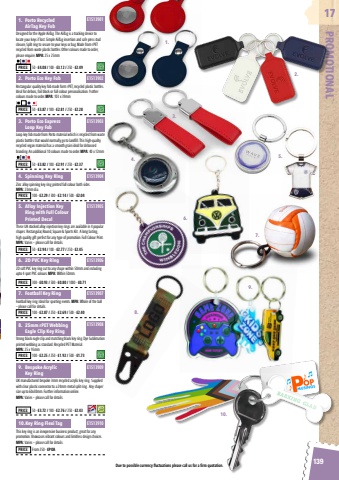 Due to possible currency fluctuations please call us for a firm quotation.139PROMOTIONAL17Designed for the Apple AirTag. The AirTag is a tracking device to locate your keys if lost. Simple AirTag insertion and safe press stud closure, Split ring to secure to your keys or bag. Made from rPET recycled from waste plastic bottles. Other colours made to order, please enquire. MPA: 25 x 25mmRectangular quality key fob made form rPET, recycled plastic bottles. Ideal for deboss, foil block or full colour personalisation. 9 other colours made to order. MPA: 103 x 39mmLoop key fob made from Porto material which is recycled from waste plastic bottles that would normally go to landfill. This high-quality recycled vegan material has a smooth grain ideal for debossed branding. An additional 10 colours made to order. MPA: 40 x 12mmThese UK stocked alloy injection key rings are available in 4 popular shapes: Rectangular, Round, Square & Sports Kit. A long lasting, high quality gift perfect for any type of promotion. Full Colour Print. MPA: Varies %u2013 please call for details.Zinc alloy spinning key ring printed full colour both sides. MPA: 23mm dia.2D soft PVC key ring cut to any shape within 50mm and including upto 4 spot PVC colours. MPA: Within 50mm.Football key ring. Ideal for sporting events. MPA: Whole of the ball %u2013 please call for details.Strong black eagle clip and matching black key ring. Dye Sublimation printed webbing as standard. Recycled PET Material. MPA: 25 x 95mm1. Porto Recycled AirTag Key Fob2. Porto Eco Key Fob3. Porto Eco Express Loop Key Fob5. Alloy Injection Key Ring with Full Colour Printed Decal4. Spinning Key Ring6. 2D PVC Key Ring7. Football Key Ring8. 25mm rPET Webbing Eagle Clip Key RingPRICE: 50 - %u00a34.08 / 100 - %u00a33.12 / 250 - %u00a32.49PRICE: 50 - %u00a33.87 / 100 - %u00a32.81 / 250 - %u00a32.28PRICE: 50 - %u00a33.82 / 100 - %u00a32.91 / 250 - %u00a32.37PRICE: 50 - %u00a32.94 / 100 - %u00a32.77 / 250 - %u00a32.45PRICE: 100 - %u00a32.29 / 300 - %u00a32.14 / 500 - %u00a32.04PRICE: 300 - %u00a30.93 / 500 - %u00a30.80 / 1000 - %u00a30.71PRICE: 100 - %u00a32.87 / 250 - %u00a32.69 / 500 - %u00a32.40PRICE: 100 - %u00a32.25 / 250 - %u00a31.92 / 500 - %u00a31.73E1513901E1513902E1513903E1513905E1513904E1513906E1513907This key ring is an inexpensive business product; great for any promotion. Showcases vibrant colours and limitless design choices. MPA: Varies %u2013 please call for details.10.Key Ring Flexi TagPRICE: From 250 - %u00a3POAE1513910E1513908UK manufactured bespoke 3mm recycled acrylic key ring. Supplied with clear plastic connector to a 24mm metal split ring. Any shape/size up to 60x30mm. Further information online. MPA: Varies %u2013 please call for details.9. Bespoke Acrylic Key RingPRICE: 50 - %u00a33.72 / 100 - %u00a32.76 / 250 - %u00a32.43E15139091.2.3.4. 5.6.7.8.9.10.