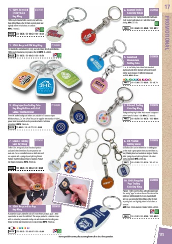 Due to possible currency fluctuations please call us for a firm quotation.141PROMOTIONAL17Trolley Coins are a practical and functional product available in the dimensions of a one pound or one euro coin. Can be enamelled on one or both sides and are supplied with a spring clip and split ring fitment. Pantone matched colours. Choice of platings. Product not shown in catalogue. MPA: 21mm dia.A pocket ice scraper and trolley coin all- in-one. Never get stuck again - at the supermarket or when the cold bites! This unique product is a mini ice scraper with an embedded, removeable trolley coin with double-sided branding areas.Strong bevelled edge for precise ice or snow removal. MPA: 21mm dia.100% recycled plastic trolley coin key ring with snap hook fitting. Made in the UK from recycled plastic and digitally printed in full colour as standard. MPA: 21mm dia.Trolley coin key ring. Stamped and infilled with upto 4 soft enamel spot colours on 1 side. Silver nickel plating. MPA: 22.5 dia.The Standard in promotional key rings, your advertising directly printed onto a 100% recycled plastic key ring made in the UK! MPA: 26 x 34mmThese UK stocked trolley coin holders are available in 5 fantastic shapes: Wishbone, House, Car, Tree & Paw. They can be supplied with round or 12-sided pound sized tokens which can be personalised with a full colour printed decal. MPA: 20mm dia.%u00a31 or 1%u20ac size Trolley Coins. Made from anodised aluminium and either stamped with a soft enamel infill or laser engraved. 13 different colours are available. MPA: All over.Trolley coin key ring in silver. Hard enamel background printed upto full colour 1 side. MPA: 22.5mm dia.UK Trolley Coins can be delivered in 10 working days so they make a great option when you need them in a hurry! Nickel plated and available in Single or Double sided. Spring clip and split ring fitment. Full colour print as standard. MPA: 21mm dia.PopCoin - Trolley Coin Key Ring, with a brandable coin that neatly %u201cpops%u201d in and out for use. The coin and the holder are both brandable to 2 sides. Supplied with split ring and connector fitting. Made in the UK from recycled plastic and digitally printed in full colour as standard.MPA: Coin: 22mm diameter / Holder: 53mm x 32mm7. Enamel Trolley Coin Key Ring9. 100% Recycled Ice PopKey Ring1. 100% Recycled Trolley Coin Key Ring2. Enamel Trolley Coin Key Rings3. 100% Recycled PFK Key Ring5. Alloy Injection Trolley Coin Key Ring Holders with Full Colour Printed Decal4. Anodised Aluminium Trolley Coin6 Printed Trolley Coin Key Ring8. UK Printed Trolley Coins10. 100% Recycled %u2018Pop%u2019 Trolley Coin Key RingPRICE: 100 - %u00a30.77 / 250 - %u00a30.63 / 500 - %u00a30.60PRICE: 250 - %u00a31.12 / 500 - %u00a30.97 / 1000 - %u00a30.89PRICE: 250 - %u00a30.76 / 500 - %u00a30.62 / 1000 - %u00a30.52PRICE: 300 - %u00a30.64 / 500 - %u00a30.60 / 1000 - %u00a30.57PRICE: 250 - %u00a30.72 / 500 - %u00a30.62 / 1000 - %u00a30.53PRICE: 50 - %u00a34.09 / 100 - %u00a33.77 / 250 - %u00a33.48PRICE: 100 - %u00a31.00 / 250 - %u00a30.89 / 500 - %u00a30.79PRICE: 300 - %u00a30.74 / 500 - %u00a30.70 / 1000 - %u00a30.66PRICE: 100 - %u00a32.05 / 250 - %u00a31.34 / 500 - %u00a31.26PRICE: 250 - %u00a31.41 / 500 - %u00a31.04 / 1000 - %u00a30.89E1514107E1514109E1514101 E1514102E1514103E1514105E1514104E1514106E1514108E1514110