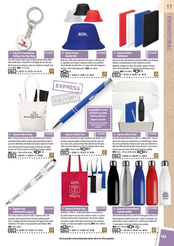 Due to possible currency fluctuations please call us for a firm quotation.143PROMOTIONAL17Say goodbye to stress and hello to speedy delivery with our Express service! All express orders are placed subject to our terms & conditionsThe perfect way to showcase your branding and get noticed.Made from durable plastic, along with a metal trigger clip and split ring. NB the print area is compact, so font size should be no smaller than size 8. White. MPA: 15 x 15mmMake a lasting impression at all your promotional events with this perfect Merch Bag solution. Imagine goody bags delivered right to your event, filled with promotional merchandise ready to be handed out! Select your perfect bag and design, sit back and relax while we take care of the rest, please call for details of options available.MPA: Varies %u2013 Please call for details.This Express lanyard is perfect for offices, hospitals, events and giveaways. 20mm lanyard features full-colour printing on both sides, a complimentary black safety break, and trigger clip for added convenience. The Express service guarantees quick delivery. White.MPA: 900 x 20mmMade from 100% cotton material, this hat boasts a soft lining and an adjustable inner band for maximum comfort and a perfect fit. Personalise your hat with either a 1-4 spot or full-colour design to 1 position. Further information online. MPA: 60 x 60mmAvailable in as little as 1 working day! Express 5oz Cotton Bag is the perfect choice for any occasion. Customise it with a 1-4 spot or full-colour print to make it uniquely yours. Choose from 5 vibrant core colours, durable 100% cotton material, long 70cm reinforced handles, can easily carry weights of up to 7kg. MPA: 300 x 300mmEasily meet those tight deadlines with Express Malta! Each notebook includes a matching-coloured elastic belly-band and fabric bookmark. Soft-touch A5 cover in PU leather contains 100 lined sheets.Personalised with a 1-4 spot colour or full-colour print to 1 position. MPA: 90 x 90mmGet your MerchBox delivered in as little as 1 working day! 4 sizes to choose from. Select your preferred box size, printed designs, custom box names, and delivery method to make it your own. Delivered in a white box filled with delicate white shreds, this box is sure to make a lasting impression. Please call for details of options available. MPA: Varies %u2013 Please call for detailsElevate your writing with our stylish aluminium pen ideal for a host of various giveaways. Rubber soft-touch body with clip, rings, and tip in silver, with a jumbo cartridge filled with blue ink. All express orders are placed subject to our terms & conditions. Please ask for details. MPA: 70mm x 8mm500ml double-walled bottle is perfect for keeping your drinks at the ideal temperature, whether hot or cold! 4 colours in both gloss and matt finishes, as well as stainless steel. Customise your bottle with 1-4 spot colours or full-colour printing to one position. MPA: 222 x 120mm1. Express Promotional Trolley Coin Key RIng4. Express Merch Bag6. Express Dye Sublimated Lanyard2. Express Lesa Bucket Hat7. Express Cotton Bag3. Express Malta NotebookExpress Dallas Pen 5. Express Merch Box8. Express Promotional Capella BottlePRICE: 25 - %u00a32.75 / 50 - %u00a31.75 / 100 - %u00a31.13PRICE: 5 - %u00a333.54 / 10 - %u00a324.27 / 50 - %u00a310.90PRICE: 50 - %u00a32.94 / 100 - %u00a31.82 / 250 - %u00a31.36PRICE: 25 - %u00a35.68 / 50 - %u00a35.01 / 100 - %u00a34.21PRICE: 25 - %u00a34.47 / 50 - %u00a32.84 / 100 - %u00a31.86PRICE: 25 - %u00a35.16 / 50 - %u00a34.26 / 100 - %u00a33.24PRICE: 5 - %u00a337.84 / 10 - %u00a328.39 / 50 - %u00a318.73PRICE: 25 - %u00a32.84 / 50 - %u00a31.92 / 100 - %u00a31.05PRICE: 25 - %u00a311.33 / 50 - %u00a39.35 / 100 - %u00a38.10E1514301E1514304E1514306E1514302E1514307E1514303E151007 E1514305E1514308
