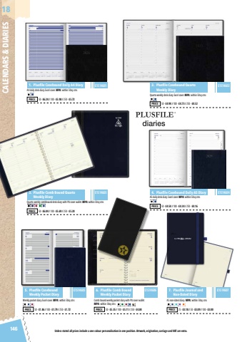 Unless stated all prices include a one colour personalisation in one position. Artwork, origination, carriage and VAT are extra. 146CALENDARS & DIARIES186MondayTuesdayWednesdayThursdayFridaySaturdaySundayNotesJANUARY Week 2891011DECEMBERJANUARYWk M TW T F S S53 1231 4 5 6 7 8 9 102 11 12 13 14 15 16 173 18 19 20 21 22 23 244 25 26 27 28 29 30 31121310Today%u2019s historical event %u2013 1806 Horatio Nelson was buried in St Paul's CathedralEscos MM NZ RURUAT CH CY DE ES FI GR IQ IT LB PL RU SE SKEG KH RURU20268:009:0010:0011:0012:001:002:003:004:005:006:007:008:00NotesJANUARYWk M T W T F S S53 1231 4 5 6 7 8 9 102 11 12 13 14 15 16 173 18 19 20 21 22 23 244 25 26 27 28 29 30 31FEBRUARYWk M T W T F S S5 12345676 8 9 10 11 12 13 147 15 16 17 18 19 20 218 22 23 24 25 26 27 28MARCHWk M T W T F S S9 123456710 8 9 10 11 12 13 1411 15 16 17 18 19 20 2112 22 23 24 25 26 27 2813 29 30 31APRILWk M T W T F S S13 123414 5 6 7 8 9 10 1115 12 13 14 15 16 17 1816 19 20 21 22 23 24 2517 26 27 28 29 30MAYWk M T W T F S S17 1 218 3 4 5 6 7 8 919 10 11 12 13 14 15 1620 17 18 19 20 21 22 2321 24 25 26 27 28 29 3022 31JUNEWk M T W T F S S22 1 2 3 4 5 623 7 8 9 10 11 12 1324 14 15 16 17 18 19 2025 21 22 23 24 25 26 2726 28 29 30JANUARY Week 01Saturday62 %u00b7 363 BN CH IN RO SI8:009:0010:0011:0012:001:002:003:004:005:006:007:008:00NotesJULYWk M T W T F S S26 123427 5 6 7 8 9 10 1128 12 13 14 15 16 17 1829 19 20 21 22 23 24 2530 26 27 28 29 30 31AUGUSTWk M T W T F S S30 131 2 3 4 5 6 7 832 9 10 11 12 13 14 1533 16 17 18 19 20 21 2234 23 24 25 26 27 28 2935 30 31SEPTEMBERWk M T W T F S S35 1 2 3 4 536 6 7 8 9 10 11 1237 13 14 15 16 17 18 1938 20 21 22 23 24 25 2639 27 28 29 30OCTOBERWk M T W T F S S39 12340 4 5 6 7 8 9 1041 11 12 13 14 15 16 1742 18 19 20 21 22 23 2443 25 26 27 28 29 30 31NOVEMBERWk M T W T F S S44 1 2 3 4 5 6 745 8 9 10 11 12 13 1446 15 16 17 18 19 20 2147 22 23 24 25 26 27 2848 29 30DECEMBERWk M T W T F S S48 1 2 3 4 549 6 7 8 9 10 11 1250 13 14 15 16 17 18 1951 20 21 22 23 24 25 2652 27 28 29 30 31Sunday72026 JANUARY3 %u00b7 362Today%u2019s historical event - 2000 The final Peanuts daily cartoon strip appearedKW2026A4 daily desk diary. Excel cover. MPA: within 50sq cmsQuarto weekly combbound desk diary with PU cover wallet. MPA: within 50sq cmsQuarto weekly desk diary. Excel cover. MPA: within 50sq cmsA5 daily desk diary. Excel cover. MPA: within 50sq cms1.%u0009 Plusfile Casebound Daily A4 Diary3.%u0009 Plusfile Comb Bound QuartoWeekly Diary2.%u0009 Plusfile Casebound QuartoWeekly Diary4.%u0009 Plusfile Casebound Daily A5 DiaryPRICE: 50 - %u00a36.24 / 100 - %u00a35.98 / 250 - %u00a35.72PRICE: 50 - %u00a36.04 / 100 - %u00a35.69 / 250 - %u00a35.20PRICE: 50 - %u00a34.94 / 100 - %u00a34.73 / 250 - %u00a34.52PRICE: 50 - %u00a34.54 / 100 - %u00a34.34 / 250 - %u00a34.16E1514601E1514603E1514602E1514604Weekly pocket diary. Excel cover. MPA: within 50sq cms Comb bound weekly pocket diary with PU cover wallet.MPA: within 50sq cmsA5 non-dated diary. MPA: within 50sq cms5.%u0009 Plusfile CaseboundWeekly Pocket Diary6.%u0009 Plusfile Comb BoundWeekly Pocket Diary7.%u0009 Plusfile Journal andNon-Dated DiaryPRICE: 50 - %u00a31.86 / 100 - %u00a31.79 / 250 - %u00a31.72 PRICE: 50 - %u00a35.35 / 100 - %u00a35.11 / 250 - %u00a34.84 PRICE: 25 - %u00a33.18 / 50 - %u00a33.09 / 100 - %u00a33.00E1514605 E1514606 E1514607