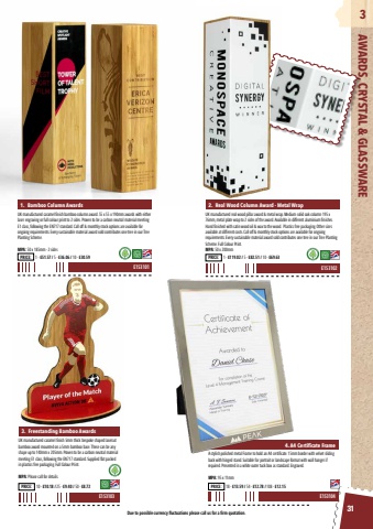 Due to possible currency fluctuations please call us for a firm quotation.31AWARDS, CRYSTAL & GLASSWARE3UK manufactured caramel finish bamboo column award. 55 x 55 x 190mm awards with either laser engraving or full colour print to 2 sides. Proven to be a carbon neutral material meeting E1 class, following the EN717 standard. Call off & monthly stock options are available for ongoing requirements. Every sustainable material award sold contributes one tree in our Tree Planting Scheme. MPA: 50 x 185mm - 2 sidesUK manufactured real wood pillar award & metal wrap. Medium solid oak column 195 x 76mm, metal plate wrap to 2 sides of the award. Available in different aluminium finishes. Hand finished with satin wood oil & wax to the wood. Plastics free packaging. Other sizes available at different costs. Call off & monthly stock options are available for ongoing requirements. Every sustainable material award sold contributes one tree in our Tree Planting Scheme. Full Colour Print.MPA: 50 x 200mmUK manufactured caramel finish 5mm thick bespoke shaped lasercut bamboo award mounted on a 5mm bamboo base. These can be any shape up to 140mm x 205mm. Proven to be a carbon neutral material meeting E1 class, following the EN717 standard. Supplied flat packed in plastics free packaging. Full Colour Print.MPA: Please call for details.A stylish polished metal Frame to hold an A4 certificate. 15mm border with velvet sliding back with hinged stand. Suitable for portrait or landscape format with wall hanger if required. Presented in a white outer tuck box as standard. Engraved.MPA: 95 x 11mm1. Bamboo Column Awards 2. Real Wood Column Award - Metal Wrap3. Freestanding Bamboo Awards4. A4 Certificate FramePRICE: 1 - %u00a351.57 / 5 - %u00a336.06 / 10 - %u00a330.59 PRICE: 1 - %u00a3119.02 / 5 - %u00a382.51 / 10 - %u00a369.63 PRICE: 10 - %u00a310.18 / 25 - %u00a39.40 / 50 - %u00a38.72 PRICE: 18 - %u00a313.59 / 54 - %u00a312.78 / 108 - %u00a312.15 E153101 E153102E153103 E153104