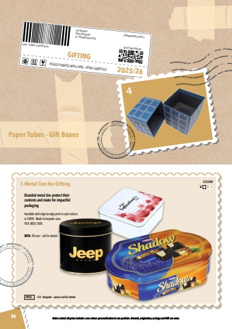 Unless stated all prices include a one colour personalisation in one position. Artwork, origination, carriage and VAT are extra. 34GIFTING4Paper Tubes %u00b7 Gift Boxes## UK TRACKING ##UK PRIORITYRATE APPROVEDID: PROMO2025/2026(PROMOMERCH DEPT.)PLEASE HANDLE WITH CARE - OPEN CAREFULLYGIFTING2025/26Code: 120866-31060918-264E150502Slender aluminium ball pen with twist-action mechanism. Available in a wide range of on-trend gloss colours. Suitable for laser engraving, spot colour printing or Ultra HD printing. MPA: 40 x 18mm2. Cheviot Fashion Ball PenPRICE: 250 - %u00a31.17 / 500 - %u00a30.99 / 1000 - %u00a30.91Unless stated all prices include a one colour personalisation in one position. Artwork, origination, carriage and VAT are extra.E153401Branded metal tins protect their contents and make for impactful packaging.Available with edge-to-edge print in spot colours or CMYK. Made to bespoke sizes. POA. MOQ 5000.MPA: All over - call for details1.Metal Tins for GiftingUnless stated all prices include a one colour personalisation in one position. Artwork, origination, carriage and VAT are extra.PRICE: 5000 - Bespoke %u2013 please call for details34