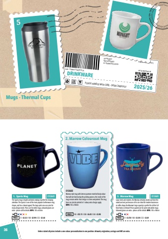## UK TRACKING ##UK PRIORITYRATE APPROVEDID: PROMO2025/2026(PROMOMERCH DEPT.)PLEASE HANDLE WITH CARE - OPEN CAREFULLYDRINKWARE2025/26Code: 120866-31060918-26Mugs %u00b7 Thermal Cups5The Sparta mug is bright and bold, making it perfect for drawing attention. The Sparta is one of the most popular Earthenware mug shapes, and has a broad appeal. The large print area can cater for many design needs. Prices are for white mugs, coloured glazes are extra - please call for details. MPA: 185 x 65mmLarge sleek and modern, the Marrow certainly stands out from the crowd and not just because of its size. Ideal for modern businesses or coffee shops the Marrow%u2019s large capacity is perfect for all the Caffeine-holics in Britain! Prices quoted are for print onto white mugs. Coloured glazes are extra - please call for details. MPA: 185 x 40mm1. Sparta Mug 3. Marrow MugPRICE: 72 - %u00a33.32 / 108 - %u00a32.99 / 252 - %u00a32.64 PRICE: 72 - %u00a33.70 / 108 - %u00a33.39 / 252 - %u00a33.01Unless stated all prices include a one colour personalisation in one position. Artwork, origination, carriage and VAT are extra.E153601 E1536032. Marrow Colourcoat MugMarrow style mug with intense pantone matched body colour that will not fade during the printing process, the inside of the mug remains white. Your design is screen overprinted. The mug base can also be printed in 1 colour, extra charges apply.MPA: 185 x 40mmPRICE: 144 - %u00a312.11 / 288 - %u00a36.41 / 504 - %u00a35.90E15360236