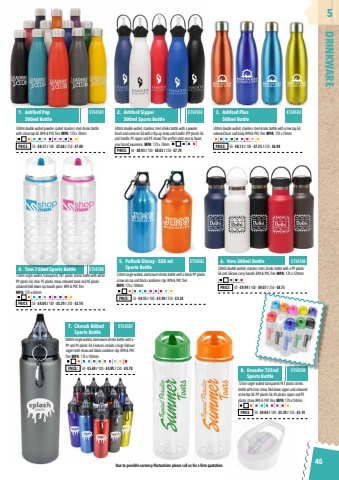 Due to possible currency fluctuations please call us for a firm quotation.45DRINKWARE5500ml double walled powder coated stainless steel drinks bottle with screw top lid. BPA & PVC free. MPA: 170 x 70mm500ml double walled, stainless steel drinks bottle with a powder finish and screw on lid with a flip up straw and handle. (PP plastic lid and handle, PS sipper and PE straw). The perfect print area to boost your brand awareness. MPA: 170 x 70mm500ml double walled, stainless steel drinks bottle with screw top lid, coloured base and body. BPA & PVC free. MPA: 170 x 70mm800ml single walled, aluminium drinks bottle with a PP and PS plastic lid. Features include a large fold out sipper with straw and black carabiner clip. BPA & PVC free. MPA: 170 x 100mm725ml single walled transparent PET plastic drinks bottle with clear straw, fold down sipper and coloured screw top lid. PP plastic lid, AS plastic sipper and PE plastic straw. BPA & PVC free. MPA: 170 x150mm550ml single walled, aluminium drinks bottle with a black PP plastic screw on cap and black carabineer clip. BPA & PVC free. MPA: 170 x 100mm500ml double walled, stainless steel, drinks bottle with a PP plastic lid and silicone carry handle. BPA & PVC free. MPA: 170 x 120mm1. Ashford Pop 500ml Bottle2. Ashford Sipper 500ml Sports Bottle3. Ashford Plus 500ml Bottle7. Cherub 800ml Sports Bottle8. Evander 725ml Sports Bottle5. Pollock Glossy - 550 ml Sports Bottle6. Varo 500ml BottlePRICE: 50 - %u00a38.57 / 100 - %u00a37.68 / 250 - %u00a37.40PRICE: 50 - %u00a38.93 / 100 - %u00a38.03 / 250 - %u00a37.74PRICE: 50 - %u00a38.12 / 100 - %u00a37.25 / 250 - %u00a36.98PRICE: 50 - %u00a35.69 / 100 - %u00a34.89 / 250 - %u00a34.70PRICE: 50 - %u00a34.04 / 100 - %u00a33.29 / 250 - %u00a33.14PRICE: 50 - %u00a34.15 / 100 - %u00a33.39 / 250 - %u00a33.24PRICE: 50 - %u00a39.99 / 100 - %u00a39.07 / 250 - %u00a38.75E154501 E154502 E154503E154507E154508E154505 E154506750ml single walled, transparent, PET plastic drinks bottle with white PP plastic lid, clear PE plastic straw, coloured band and AS plastic coloured fold down sip mouth piece. BPA & PVC free. MPA: 170 x 60mm4. Tarn 750ml Sports BottlePRICE: 50 - %u00a34.04 / 100 - %u00a33.29 / 250 - %u00a33.14E154504