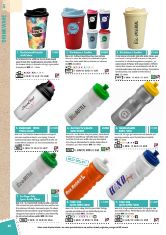 Unless stated all prices include a one colour personalisation in one position. Artwork, origination, carriage and VAT are extra. 46DRINKWARE5The full colour Universal Tumbler can have any design wrapped around the body of the mug. Manufactured and printed in the UK, this microwave and top-rack dishwasher safe mug is a great product for everyday use. MPA: 241 x 126mmMade in UK - Bright and colourful travel mugs. Huge print area. Choice of 11 colours. Mix and Match lids available with 3 styles to choose from. Double walled. BPA free, dishwasher and microwave safe. MPA: 235 x 80mmMade in UK - Just like all our other plastic products, the Bio Bottle is Recyclable. It%u2019s special because unlike other plastics it breaks down much faster if it ends up in landfill or the ocean. Once disposed of, in a few years it becomes food for microbes leaving behind no microplastics, just natural remnant. MPA: 140 x 89mmMade in UK - The environmentally friendly Eco bottle is made from 100% reclaimed food grade material that has been saved from landfill by collection of milk bottles from council recyclers. The colour is dependent on how many labels or caps get through the remanufacturing process, hence why they are off white in colour. Patented flip clip, valve and push pull caps available. MPA: 140 x 89mmMade in UK - The best selling 500ml Grip sports bottle. The finger grips allow you to hold on with ease. Patented flip clip, valve and push pull caps available. MPA: 140 x 89mmMade in UK - The larger sports bottle comes with decorative pearl drop design around the neck of the bottle. Mix and match lids. MPA: 95 x 85mmMade in UK - A larger capacity sports bottle. The finger grips allow you to hold on with ease. Patented flip clip, valve and push pull caps available. MPA: 140 x 110mm1. The Universal Tumbler - Full Colour2. The Universal Tumbler 5. Bio Finger Grip Sports Bottle 500ml7. Eco Finger Grip Sports Bottle 500ml8. Finger Grip Sports Bottle 500ml6. Teardrop Sports Bottle 750ml9. Finger Grip Sports Bottle 750mlPRICE: 50 - %u00a35.49 / 100 - %u00a34.41 / 250 - %u00a33.84 PRICE: 50 - %u00a34.37 / 100 - %u00a33.16 / 250 - %u00a32.95 PRICE: 50 - %u00a32.96 / 100 - %u00a32.10 / 250 - %u00a31.64 PRICE: 50 - %u00a32.96 / 100 - %u00a32.10 / 250 - %u00a31.64 PRICE: 50 - %u00a32.77 / 100 - %u00a31.92 / 250 - %u00a31.46 PRICE: 50 - %u00a32.96 / 100 - %u00a32.10 / 250 - %u00a31.72PRICE: 50 - %u00a32.96 / 100 - %u00a32.10 / 250 - %u00a31.72E154601 E154602E154605E154607E154608E154606E154609The Bio Universal is Recyclable. Unlike other plastics it breaks down much faster if it ends up in landfill or the ocean. In a few years it becomes food for microbes leaving behind no microplastics, just natural remnant. The Pantone of the Lid and Tumbler is 7499C.The Universal Bio is microwave and top-rack dishwasher safe, BPA free and double-walled to keep drinks warmer for longer. Please note that full-colour printing is not available for the Bio Universal. MPA: 235 x 80mm3. Bio Universal TumblerPRICE: 50 - %u00a34.56 / 100 - %u00a33.34 / 250 - %u00a33.13 E154603FF FMade in UK - The 700ml/24oz Shakermate features an integrated mesh mixer, rounded inner base for easier cleaning, 10 mix and match lid and clip colours and displays capacity levels to either side in ml/oz. BPA Free. Dishwasher safe. Direct screen printed front and back. MPA: 70 x 90mm4. Shakermate - 700ml Protein ShakerPRICE: 50 - %u00a34.54 / 100 - %u00a33.34 / 250 - %u00a32.77 E154604