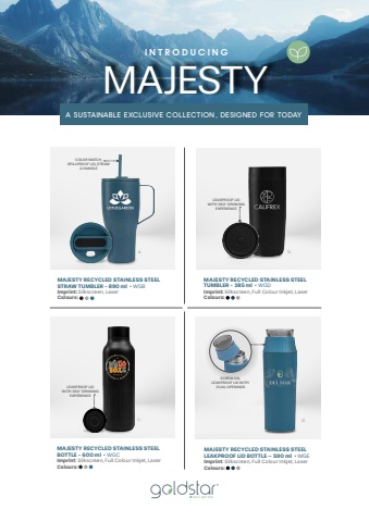 50MAJESTY RECYCLED STAINLESS STEELBOTTLE - 600 ml %u2022 WGCImprint: Silkscreen, Full Colour Inkjet, LaserColours:MAJESTY RECYCLED STAINLESS STEELSTRAW TUMBLER - 890 ml %u2022 WGBColours:Imprint: Silkscreen, LaserMAJESTY RECYCLED STAINLESS STEELTUMBLER - 385 ml %u2022 WGDImprint: Silkscreen, Full Colour Inkjet, LaserColours:MAJESTY RECYCLED STAINLESS STEELLEAKPROOF LID BOTTLE %u2013 590 ml %u2022 WGEImprint: Silkscreen, Full Colour Inkjet, LaserColours:a.c.b.d.MAJESTYA SUSTAINABLE EXCLUSIVE COLLECTION , DESIGNED FOR TODAY I N T R O D U C I N GLEAKPROOF LID WITH 360%u00b0 DRINKING EXPERIENCECOLOR MATCH, SPILLPROOF LID, STRAW & HANDLELEAKPROOF LID WITH 360%u00b0 DRINKING EXPERIENCESCREW ON, LEAKPROOF LID WITH DUAL OPENINGS