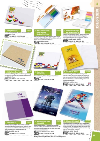 Due to possible currency fluctuations please call us for a firm quotation.57DESK & OFFICE6True A7 (105x75mm) Sticky Note, 50 Sheets white paper. Printed full colour. MPA: 101 x 71mmSmart Book containing 50 sheets white paper from a sustainable source with a 300gsm gloss laminated card cover book/perfect bound. Bulk packed. Price includes full colour to front & back cover (wraparound print), extra costs are for printing to sheets 1 side.MPA: Template Available - please callVisible, functional and budget friendly, 300gsm full colour card cover containing 1 x sticky note (full colour) 70x75mm 25 sheets and 1 x set of plastic neon page markers. Printed full colour.MPA: Template available - please call.Manufactured with 30% grass fibres sourced from European farming, Grass Paper Sticky Notes offer a new eco-friendly option. Printed full colour. MPA: 101 x 71mmNotepad containing 50 sheets of white paper from a sustainable source with a 300gsm gloss laminated card front and back cover. Wiro bound on the long edge with white wire. Bulk packed. Price is based on print to cover, lined sheets 1 side.MPA: Cover - 133 x 200mm, Sheets - 133 x 200mm.One of the most popular of the Combi Set products. The hard cover Combi offers a high end finish with multiple branding options. Contains sticky note pad and coloured page markers. Printed full colour. MPA: Template Available - please callSewn book containing 32 sheets of white sustainably sourced paper with a 300gsm anti scuff matt laminated front and back card cover. Cover sewn on long left edge with white thread. Bulk packed. Manufactured in the UK in our Carbon Zero factory with social and environmental responsibility.MPA: Template available on request.Notepad containing 50 sheets white paper from a sustainable source with a 1750 micron gloss laminated hardbacked cover. Full colour print to front & back cover. Wiro bound along the left hand side with white wire. Bulk packed. Pricing is for full colour print to front & back cover, extra costs are for printing to sheets 1 side.MPA: Template Available - please call1. Sticky Notes (A7)7. Smart Book A52. Midi Combiset Sticky Notes and Page Markers 70 x 75mm4. Sticky Notes Grass Paper8. WiroSmart Card Cover Notepad A53. Hardback Sticky Paper and Marker Combi Set6. Smart Book %u2013 Sewn 9. Wiropod A5 NotepadPRICE: 100 - %u00a32.67 / 250 - %u00a31.55 / 500 - %u00a30.94PRICE: 100 - %u00a33.49 / 250 - %u00a32.17 / 500 - %u00a31.75PRICE: 100 - %u00a35.50 / 250 - %u00a32.39 / 500 - %u00a31.78PRICE: 100 - %u00a33.44 / 250 - %u00a31.85 / 500 - %u00a31.23PRICE: 100 - %u00a34.45 / 250 - %u00a32.42 / 500 - %u00a31.86PRICE: 250 - %u00a36.19 / 500 - %u00a34.01 / 1000 - %u00a33.01PRICE: 100 - %u00a33.99 / 250 - %u00a32.59 / 500 - %u00a32.04PRICE: 100 - %u00a35.07 / 250 - %u00a33.22 / 500 - %u00a32.59E155701E155707E155702E155704E155708E155703E155706E15570975x75mm Sticky Note, 50 sheets white paper. Printed full colour.MPA: 71 x 71mm5. Sticky Notes (75 x 75mm)PRICE: 100 - %u00a32.41 / 250 - %u00a31.42 / 500 - %u00a30.89E155705
