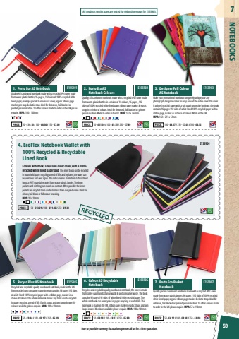 Due to possible currency fluctuations please call us for a firm quotation.59NOTEBOOKS7E155901E155905E155902E155906E155903E155907Quality A5 casebound notebook made with a recycled rPet cover made from waste plastic bottles, 96 pages , 192 sides of 100% recycled white lined paper, envelope pocket to inside rear cover, organic ribbon page marker, pen loop & elastic strap. Ideal for debosses, foil blocked or printed personalisation. 10 other colours made to order in the UK please enquire. MPA: 100 x 100mmRecycled and recyclable quality casebound notebook, made in the UK from recycled post consumer waste. Interior contains 96 pages 192 sides of white lined 100% recycled paper with a ribbon page, marker in a choice of colours. The whole notebook minus any trims can be recycled in paper recycling at end of life. Elastic straps and pen loops in over 30 colours available, please enquire. MPA: 100 x 100mmQuality A5 casebound notebook made with a recycled rPET cover made from waste plastic bottles in a choice of 10 colours, 96 pages , 192 sides of 100% recycled white lined paper, ribbon page marker & elastic strap in a choice of colours. Ideal for debossed, foil blocked or printed personalisation. Made to order in the UK. MPA: 147 x 263mmRecycled and recyclable quality casebound notebook, the cover is made from coffee cup manufacturing waste & post consumer waste. The book contains 96 pages 192 sides of white lined 100% recycled paper. The whole notebook can be recycled in paper recycling at end of life. This notebook is made in the UK, ribbon page markers, elastic straps and pen loops in over 30 colours available please enquire. MPA: 100 x 100mmMake your promotional notebook completely unique, use any photograph, design or colour to wrap around the entire cover. The cover is printed recycled paper with a soft touch protective laminate, the book contains 96 pages 192 sides of white lined 100% recycled paper with a ribbon page, marker in a choice of colours. Made in the UK. MPA: 142 x 215 x 12mmQuality pocket casebound notebook made with a recycled rPET cover made from waste plastic bottles, 96 pages , 192 sides of 100% recycled white lined paper, organic ribbon page marker & elastic strap. Ideal for debosses, foil blocked or printed personalisation. 10 other colours made to order in the UK please enquire. MPA: 57 x 110mm1. Porto Eco A5 Notebook5. Recyco Plus A5 Notebook2. Porto Eco A5 Notebook Colours6. Cafeco A5 Recyclable Notebook3. Designer Full Colour A5 Notebook7. Porto Eco Pocket NotebookPRICE: 50 - %u00a310.10 / 100 - %u00a38.30 / 250 - %u00a37.00PRICE: 50 - %u00a39.94 / 100 - %u00a38.17 / 250 - %u00a36.89 PRICE: 50 - %u00a311.30 / 100 - %u00a39.35 / 250 - %u00a37.89 PRICE: 50 - %u00a39.94 / 100 - %u00a38.17 / 250 - %u00a36.89 PRICE: 100 - %u00a38.17 / 250 - %u00a37.05 / 500 - %u00a36.32 PRICE: 50 - %u00a36.12 / 100 - %u00a34.84 / 250 - %u00a34.00E155904 4. EcoFlex Notebook Wallet with 100% Recycled & Recyclable Lined BookPRICE: 50 - %u00a313.21 / 100 - %u00a311.02 / 250 - %u00a39.33EcoFlex Notebook, a reusable outer cover, with a 100% recycled white lined paper pad. The inner book can be recycled in household paper recycling at end of life, and replaced, the outer can be used over and over again. The outer cover is made from GRS certified Porto a rPET material recycled from waste plastic bottles. The inner pockets and stitching can match or contrast. When possible the inner pockets are recycled from waste material from our production. Ideal for deboss, foil block or full colour branding.MPA: 90 x 90mmAll products on this page are priced for debossing except for E155903.