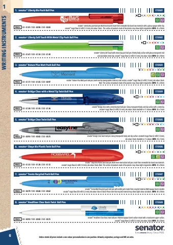 Unless stated all prices include a one colour personalisation in one position. Artwork, origination, carriage and VAT are extra. 6WRITING INSTRUMENTS1E150603E150605E150606E150608senator%u00ae Nature Plus Matt push ball pen, barell and tip bioregradable material, matt surface, senator%u00ae magic flow G2 refill (1.0 mm), ink colour: black.Note: The surface of products made of bio plastics may show slight irregularities. MPA: 45 x 20mmsenator%u00ae Bridge Clear twist ball pen. Glossy transparent body and clip surface. senator%u00ae magic flow G2 refill (1.0 mm), ink colour: black. Available in 15 colours. MPA: 30 x 15mmsenator%u00ae Skeye Bio Plastic twist ball pen. Matt finish twist-action ball pen, made from renewable bio based raw materials. senator%u00ae magic flow G2 refill (1.0 mm), ink colour: black, Note: The surface of products made of bio plastics may show slight irregularities. MPA: 30 x 20mmsenator%u00ae Headliner Clear Basic twist ball pen. Polished opaque barrel surface mixed with a translucent upper surface, senator%u00ae magic flow G2 refill (1.0 mm), ink colour: black. MPA: 30 x 20mm3. senator%u00ae Nature Plus Matt Push Ball Pen5. senator%u00ae Bridge Clear Twist Ball Pen6. senator%u00ae Skeye Bio Plastic Twist Ball Pen8. senator%u00ae Headliner Clear Basic Twist Ball PenPRICE: 500 - %u00a31.17 / 1000 - %u00a31.05 / 2500 - %u00a30.97PRICE: 500 - %u00a30.93 / 1000 - %u00a30.82 / 2500 - %u00a30.75 PRICE: 500 - %u00a31.32 / 1000 - %u00a31.20 / 2500 - %u00a31.12 PRICE: 500 - %u00a30.93 / 1000 - %u00a30.82 / 2500 - %u00a30.75 E150601senator%u00ae Liberty Bio push ball pen Matt finish barrel made from renewable bio based raw materials with a glossy opaque white clip. senator%u00ae magic flow G2 refill (1.0 mm), ink colour: black - The surface of products made of bio plastics may show slight irregularities. MPA: 45 x 20mm1. senator%u00ae Liberty Bio Push Ball PenPRICE: 500 - %u00a31.01 / 1000 - %u00a30.90 / 2500 - %u00a30.83 E150604senator%u00ae Bridge clear with a metal tip twist ball pen. Glossy transparent body and clip surface with a metal tip. senator%u00ae magic flow G2 refill (1.0 mm), ink colour: black. Available in 15 colours. MPA: 30 x 15mm4. senator%u00ae Bridge Clear with a Metal Tip Twist Ball PenPRICE: 500 - %u00a31.58 / 1000 - %u00a31.45 / 2500 - %u00a31.36E150607senator%u00ae Trento Matt Recycled push ball pen with visible parts made from, recycled material, Matt opaque barrel, durable senator%u00ae magic flow X20 refill (1,0 mm), Ink colour: blue or black. Please note that recycled material may show slight colour variations.. MPA: 40 x 20mm7. senator%u00ae Trento Recycled Push Ball PenPRICE: 500 - %u00a30.79 / 1000 - %u00a30.68 / 2500 - %u00a30.62 E150602senator%u00ae Liberty Soft Touch with metal clip push ball pen. Velvety body surface with glossy transparent mid and clip holder, metal clip. senator%u00ae magic flow G2 refill (1.0 mm), ink colour: black. MPA: 60 x 30mm2. senator%u00ae Liberty Soft Touch With Metal Clip Push Ball PenPRICE: 500 - %u00a31.67 / 1000 - %u00a31.54 / 2500 - %u00a31.44