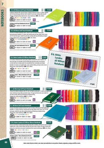 60NOTEBOOKS7Unless stated all prices include a one colour personalisation in one position. Artwork, origination, carriage and VAT are extra.E156001E156002E156004E156006E156005E156010E156007E156003E156008E156009A5 Watson notebook offers value-for-money. A hardback soft-feel PU cover in 13 colours. Supplied with 160 Ivory lined pages with date marks. Suitable for spot colour printing, debossing, foil blocking and digital printing. Optional extra: colour-matched pen. MPA: 100 x 180mmPremium A6 hardback notebooks with a PU cover and higher quality paper. 12 colours and supplied with colour matched pen loop, ribbon and elastic closure. 192 pages with date marks and suitable for spot colour printing, debossing, foil blocking and digital printing. Optional extra: colour-matched pen. MPA: 55 x 120mmA5 Watson Soft Touch Notebook & Pen SetA5 Dimes Soft Touch Notebook & Pen SetA5 Notes London - Wilson Notebook & Pen SetA5 Notes London - Blanco Notebook & Pen SetPremium A5 hardback notebooks feature a thick PU cover for deeper embossing and high-quality paper. Available in 12 colours, with matching wide pen loop, ribbon, elastic closure, and 192 Ivory lined pages. Suitable for spot colour printing, debossing, foil blocking and digital printing. Optional extra: colour-matched pen. MPA: 100 x 180mmPremium A4 hardback notebook with thick PU cover for deeper embossing and high-quality paper. Available in 12 colours, featuring a matching wide pen loop, ribbon, elastic closure, and 192 Ivory lined pages. Suitable for spot colour printing, debossing, foil blocking and digital printing. Optional extra: colour-matched pen. MPA: 100 x 180mmEco friendly A5 Notebook with a high quality, hardback, soft touch PU cover. It contains 160 Ivory Lined pages of sustainably sourced certified paper, with date marks on each page & an inside back cover envelope pocket also manufactured from sustainably sourced paper. Available in 26 colours and supplied with a colour matched ribbon, pen-loop & elastic closure. Optional extra: colour-matched pen. MPA: 100 x 180mmDeluxe eco-friendly A5 notebook offering high quality with its hardback, soft touch PU cover in 13 colours. Supplied with a colour matched ribbon, pen loop and elastic closure. Contains 160 pages of plain white paper and an inside back cover pocket, manufactured from recycled certified paper. MPA: 80 x 150mm1/2. A5 Watson Soft Touch Notebook7. A6 Moriarty Soft Touch Notebook3/4. A5 Dimes Soft Touch Notebook8. A4 Dunn Soft Touch Notebook5/6. Notes London A5 Wilson Notebook 9/10. Notes London A5 Wilson Blanco NotebookPRICE: 100 - %u00a33.37 / 250 - %u00a32.97 / 500 - %u00a32.77 PRICE: 100 - %u00a32.51 / 250 - %u00a32.17 / 500 - %u00a32.06 PRICE: 100 - %u00a34.56 / 250 - %u00a33.81 / 500 - %u00a33.42 PRICE: 100 - %u00a35.26 / 250 - %u00a34.49 / 500 - %u00a34.10 PRICE: 100 - %u00a35.18 / 250 - %u00a34.41 / 500 - %u00a34.02 PRICE: 100 - %u00a35.18 / 250 - %u00a34.41 / 500 - %u00a34.02 PRICE: 100 - %u00a34.15 / 250 - %u00a33.72 / 500 - %u00a33.52 PRICE: 50 - %u00a38.08 / 100 - %u00a36.01 / 250 - %u00a35.64 PRICE: 100 - %u00a33.99 / 250 - %u00a33.57 / 500 - %u00a33.37 PRICE: 100 - %u00a33.99 / 250 - %u00a33.57 / 500 - %u00a33.37 5/6. NotesLondonA5 WilsonNotebookE156005