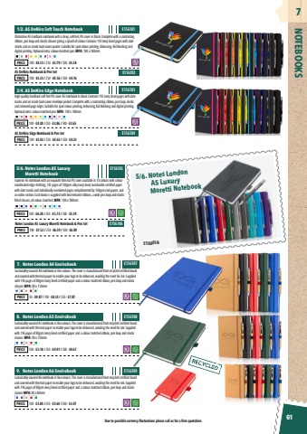61NOTEBOOKS7Due to possible currency fluctuations please call us for a firm quotation. E156101E156102E156104E156106E156105E156107E156103E156108E156109Distinctive A5 hardback notebook with a deep, soft-feel, PU cover in black. Complete with a contrasting ribbon, pen loop and elastic closure giving a splash of colour. Contains 192 ivory lined pages with date marks and an inside back cover pocket. Suitable for spot colour printing, debossing, foil blocking and digital printing. Optional extra: colour-matched pen. MPA: 100 x 180mmSustainably-sourced A4 notebook in five colours. The cover is manufactured from recycled certified board and covered with thermal paper to enable your logo to be debossed, avoiding the need for ink. Supplied with 196 pages of 80gsm Ivory lined certified paper and a colour matched ribbon, pen loop and elastic closure. MPA: 80 x 150mmA5 DeNiro Notebook & Pen SetA5 DeNiro Edge Notebook & Pen SetNotes London A5 Luxury Moretti Notebook & Pen SetHigh quality hardback soft feel PU cover A5 notebook in black. Contains 192 ivory lined pages with date marks and an inside back cover envelope pocket. Complete with a contrasting ribbon, pen loop, elastic and coloured page edges. Suitable for spot colour printing, debossing, foil blocking and digital printing. Optional extra: colour-matched pen. MPA: 100 x 180mmSustainably-sourced A5 notebook in five colours. The cover is manufactured from recycled certified board and covered with thermal paper to enable your logo to be debossed, avoiding the need for ink. Supplied with 196 pages of 80gsm Ivory lined certified paper and a colour matched ribbon, pen loop and elastic closure. MPA: 80 x 150mmSuperior A5 notebook with an exquisite thermal PU cover available in 10 colours with colour coordinated edge stitching, 192 pages of 100gsm silky Ivory lined sustainable certified paper with date marks and individually numbered pages complimented by 160gsm end papers and an index section. Each book is supplied with two textured ribbons, a wide pen loop and elastic fitted closure, all colour matched. MPA: 100 x 180mmSustainably-sourced A6 notebook in five colours. The cover is manufactured from recycled certified board and covered with thermal paper to enable your logo to be debossed, avoiding the need for ink. Supplied with 196 pages of 80gsm Ivory lined certified paper and a colour matched ribbon, pen loop and elastic closure MPA: 80 x 80mm1/2. A5 DeNiro Soft Touch Notebook7. Notes London A4 Envirobook3/4. A5 DeNiro Edge Notebook8. Notes London A5 Envirobook5/6. Notes London A5 Luxury Moretti Notebook9. Notes London A6 EnvirobookPRICE: 100 - %u00a34.23 / 250 - %u00a33.79 / 500 - %u00a33.58 PRICE: 50 - %u00a39.87 / 100 - %u00a38.33 / 250 - %u00a37.87PRICE: 100 - %u00a35.35 / 250 - %u00a34.56 / 500 - %u00a34.16 PRICE: 100 - %u00a35.42 / 250 - %u00a34.63 / 500 - %u00a34.23 PRICE: 100 - %u00a37.52 / 250 - %u00a36.59 / 500 - %u00a36.09 PRICE: 100 - %u00a34.30 / 250 - %u00a33.86 / 500 - %u00a33.65 PRICE: 100 - %u00a35.18 / 250 - %u00a34.91 / 500 - %u00a34.67PRICE: 100 - %u00a36.28 / 250 - %u00a35.73 / 500 - %u00a35.39 PRICE: 100 - %u00a33.84 / 250 - %u00a33.64 / 500 - %u00a33.475/6. Notes London A5 LuxuryMoretti NotebookE156005/6