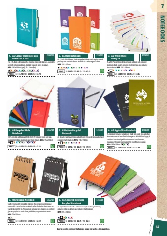 Due to possible currency fluctuations please call us for a firm quotation.67NOTEBOOKS7E156701E156704E156707E156702E156705E156708E156703E1567062-in-1 A5 Mole notebook with a matching mole mate ball pen, sourced to perfectly colour coordinate. Available in a wide range of colours. MPA: 195 x 100mm (pad), 50 x 10mm (Pen)100% recycled notebook with 80 sheets, PU coloured cover, pen loop, back pocket, ribbon bookmark and elastic closure. MPA: 195 x100mmCrafted from widely recyclable materials, this versatile spiral notepad comes with a board marker, making it perfect for jotting down notes on your desk or on the go. Personalised with your logo makes it an excellent giveaway option for trade shows, exhibitions, or promotional events. MPA: 70 x 100mmA5 PU soft finish 80 page lined notepad with book mark, pocket at back, pen loop and an elastic closure. Available in a wide range of colours. MPA: 195 x 100mmA5 Recycled wiro bound note pad with pen. Pen can be personalised and is supplied with black ink. MPA: 190 x 110mmA5 recycled notebook with a coloured cover, 90 lined recycled sheets, coloured ribbon bookmark and coloured elastic closure. MPA: 195 x 100mmA5 white PU soft finish 80 sheet lined notebook with coloured bookmark, back pocket, coloured elastic pen loop and coloured elastic closure. MPA: 195 x 100mmA5 notebook featuring a hardcover made from apple skin, a leather alternative sourced from food industry waste. With 64 lined pages, it combines functionality with environmental consciousness, showcasing the apple skin logo on the cover. Made in Europe.MPA: 195 x 100mm1. A5 Colour Mole Mate DuoNotebook & Pen4. A5 Recycled Mole Notebook7. Whiteboard Notebook2. A5 Mole Notebook5. A5 Intimo Recycled Notebook8. A5 Coloured Nebraska Recycled Notebook3. A5 White Mole Notepad6. A5 Apple Skin NotebookPRICE: 50 - %u00a35.78 / 100 - %u00a34.34 / 250 - %u00a33.74PRICE: 50 - %u00a34.27 / 100 - %u00a33.51 / 250 - %u00a33.21PRICE: 50 - %u00a33.11 / 100 - %u00a32.39 / 250 - %u00a32.12 PRICE: 50 - %u00a33.53 / 100 - %u00a32.79 / 250 - %u00a32.51PRICE: 50 - %u00a33.87 / 100 - %u00a33.12 / 250 - %u00a32.83PRICE: 50 - %u00a32.92 / 100 - %u00a32.20 / 250 - %u00a31.94PRICE: 50 - %u00a34.09 / 100 - %u00a33.34 / 250 - %u00a33.05PRICE: 50 - %u00a37.16 / 100 - %u00a36.31 / 250 - %u00a35.93