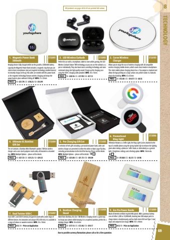 Due to possible currency fluctuations please call us for a firm quotation.69TECHNOLOGY8Keeping devices fully charged whilst on the go with a 5000mAh battery capacity, the Magnetic Power Bank includes a magnetic ring that you can stick to most smartphones (not just magnetic technology enabled devices) to instantly charge on the go. No cables are needed with this power bank as the magnetic technology features wireless charging and keeps the power bank in place without it falling off. MPA: 37 x 42mmDual USB-C and USB-A memory designed to work with a wide range of different devices. An innovative and unique OTG USB stick, it is available in a range of colours or wooden material. MPA: 24 x 14mmThe set contains a Bamboo Mini Bluetooth speaker, 15W fast wireless charger and a corn starch polymer multi cable, all branded in a branded box. MPA: Multiple Options %u2013 please call for details.Perfect for use with a smartphone, tablet or even whilst gaming, the LED Wireless Earbuds feature TWS technology, so you can use the earbuds as a pair or individually. They also boast noise cancelling technology and voice command along side high quality sound. Charge up the charging case using the USB-C charging cable provided. MPA: 30 x 15mmMade from Bamboo, this fast 15W Wireless Charging stand is a great way to charge your phone whilst keeping it in an optimal position, perfect for a desktop charger. MPA: 50 x 65mmMade of Intertek certified recycled ABS plastic. With a generous battery sizes of either 5,000 or 10,000mAh, boasting two USB output ports to charge devices simultaneously, and has both micro USB and Type C dual input and output to fast charge. MPA: 107 x 44mmOtherwise Known as a Selfie Light, the Ring Light Can be attached to the top of a mobile phone using the spring loaded clip to enhance the lighting given when taking a photo on %u2018selfie%u2019 mode, or alternatively as a general light. 3 brightness settings and a flashing option. MPA: 35mm dia.1. Magnetic Power Bank 500mAh7. Dual Twister USB-C4. Ultimate XL Bamboo Gift Set2. LED Wireless Earbuds8. Bamboo Charging Stand9. Eco Pro Power Banks6. Promotional Ring LightPRICE: 10 - %u00a321.79 / 25 - %u00a318.25 / 50 - %u00a316.99 PRICE: MOQ 10 %u2013 Price on ApplicationPRICE: 10 - %u00a337.72 / 25 - %u00a331.25 / 50 - %u00a329.22 PRICE: 10 - %u00a320.76 / 25 - %u00a317.99 / 50 - %u00a317.12 PRICE: 10 - %u00a317.13 / 25 - %u00a312.46 / 50 - %u00a310.17 PRICE: MOQ 10 %u2013 Price on ApplicationPRICE: 10 - %u00a39.360 / 25 - %u00a36.31 / 50 - %u00a34.96E156901E156907E156904E156902E156908 E156909E156906Allows you to enjoy the ease of wireless charging with all compatible wireless-charging mobile devices, which covers most modern smartphones. This sleek mobile phone charging device has a 15w output as standard and allows for logo printing on a large surface area, which makes it a fantastic choice for branding. MPA: 65 x 65mm3. Curve Wireless ChargerPRICE: 10 - %u00a312.83 / 25 - %u00a310.17 / 50 - %u00a38.55E156903A selection of tech gifts including a personalised power bank, cable and wireless charger are presented in either the white or black Large Flip Box, including personalisation to the lid of the box too. Please call for details.MPA: Multiple Options %u2013 please call for details.5. Pro Charging Gift SetPRICE: 10 - %u00a325.80 / 25 - %u00a321.73 / 50 - %u00a318.89E156905All products on pages 68 & 69 are printed full colour.