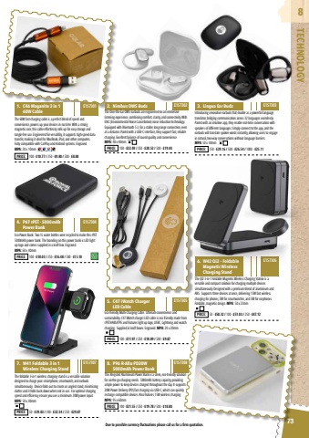 Due to possible currency fluctuations please call us for a firm quotation.73TECHNOLOGY8The 60W fast-charging cable is a perfect blend of speed and convenience, powers up your devices in no time. With a strong magnetic core, this cable effortlessly rolls up for easy storage and tangle-free use. Engineered for versatility, it supports high-speed data transfer, making it ideal for MacBook, iPad, and other computers. Fully compatible with CarPlay and Android systems. Engraved.MPA: 20 x 10mmEco Power Bank: Two 1L water bottles were recycled to make this rPET 5000mAh power bank. The branding on this power bank is LED light up logo and comes supplied in a kraft box. Engraved.MPA: 60 x 40mmThe foldable 3-in-1 wireless charging stand is a versatile solution designed to charge your smartphone, smartwatch, and earbuds simultaneously. Device folds out to create an angled stand, minimizing clutter and it folds back down when not in use. For optimal charging speed and efficiency, ensure you use a minimum 20W power input.MPA: 50 x 40mmThe Over-the-Ear OWS Earbuds are engineered for an immersive listening experience, combining comfort, clarity, and connectivity. With ENC (Environmental Noise Cancellation) noise reduction technology. Equipped with Bluetooth 5.3, for a stable, long-range connection, even at a distance. Paired with a USB-C interface, they support fast, reliable charging. Excellent balance of sound quality and convenience.MPA: 40 x 40mmEco-friendly Multi-Charging Cable. Ultimate convenience and sustainability. C47 iWatch charger LED cable is eco friendly made from rPET/rABS/rTPE and features light up logo, USBC, Lightning and iwatch charging. Supplied in kraft boxes. Engraved. MPA: 20 x 20mmThis Recycled Aluminium Power Bank is a sleek, eco-friendly solution for on-the-go charging needs. 5000mAh battery capacity, providing ample power to keep devices charged throughout the day. It supports 20W Power Delivery (PD) fast charging via USB-C, which can quickly recharge compatible devices. Also features 15W wireless charging.MPA: 95 x 60mmIntroducing innovative earbuds that double as a powerful language translator, bridging communication across 32 languages seamlessly. Paired with an intuitive app, they enable real-time conversation with speakers of different languages. Simply connect to the app, and the earbuds will translate spoken words instantly, allowing users to engage in natural, two-way conversations without language barriers.MPA: 50 x 30mmThe QI2 3-in-1 Foldable Magnetic Wireless Charging Station is a versatile and compact solution for charging multiple devices simultaneously. Designed with a premium blend of aluminium and ABS. Supports three devices at once, delivering 15W fast wireless charging for phones, 5W for smartwatches, and 5W for earphones. Foldable, magnetic design. MPA: 50 x 22mm1. C46 Maganite 3 in 1 60W Cable4. P67 rPET - 5000mAh Power Bank7. W41 Foldable 3 in 1 Wireless Charging Stand2. Nimbus OWS Budz5. C47 iWatch Charger LED Cable8. P96 R-Allu PD20W 5000mAh Power Bank3. Lingua Ear Budz6. W42 Qi2 %u2013 Foldable Magnetic Wireless Charging StandPRICE: 100 - %u00a310.77 / 250 - %u00a39.80 / 500 - %u00a38.88 PRICE: 100 - %u00a318.03 / 250 - %u00a316.48 / 500 - %u00a315.10PRICE: 50 - %u00a339.03 / 100 - %u00a332.34 / 250 - %u00a329.87PRICE: 100 - %u00a322.49 / 250 - %u00a320.52 / 500 - %u00a319.44PRICE: 100 - %u00a311.97 / 250 - %u00a310.89 / 500 - %u00a39.87PRICE: 100 - %u00a321.55 / 250 - %u00a319.78 / 500 - %u00a318.80PRICE: 250 - %u00a329.16 / 500 - %u00a326.54 / 1000 - %u00a325.11PRICE: 50 - %u00a358.32 / 100 - %u00a351.03 / 250 - %u00a347.12E157301E157304E157307E157302E157305E157308E157303E157306
