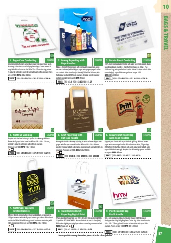 Due to possible currency fluctuations please call us for a firm quotation.87BAGS & TRAVEL10Environmentally friendly carrier bags made from Sugar Cane waste. As strong & durable as standard polythene bags, Carbon neutral & recyclable. Prices based on size 380 x 75 x 457mm size bag printed 1-colour to both sides (same design) with up to 50% coverage. Prices are per 1000. MPA: 300 x 300mmPopular with the food industry & perfect for takeaways. White or Brown Kraft paper. Prices based on A5 size 180 x 100 x 230 mm, printed 1-colour to both sides with 50% ink coverage. Prices are per 1000. MPA: 150 x 140mmOffering style & durability, these twist handled bags are available in 100gsm brown or white kraft paper. Printed spot colours. Prices based on A4 size 260 x 130 x 360 mm, printed 1-colour to both sides, with 50% ink coverage. Prices are per 1000. MPA: 230 x 310mmMake a strong first impression with high-quality luxury bags. Gloss or matt laminated, white 190gsm paper with polyprop rope handles as standard. Prices based on (A4 Portrait) 230 x 90 x 340 mm, with full-colour print and 100% ink coverage. Bespoke sizes & branding options available on request. MPA: All overA tough & durable take away style bag. In white or brown 80gsm kraft paper with flat tape external handles. A5 size 180 x 230 x 100mm, printed 1 colour to both sides (same design on each side) with 50% ink coverage. Prices are per 1000. MPA: 150 x 140mmPrices based on A5 portrait size : 190 x 80 x 210 mm printed CMYK to 1 position. SET PRINT AREAS. Also available in A4 and A3 sizes (POA). Full-colour digital print only. Spot colours cannot be pantone matched. MPA: Please call100% home compostable. Printed with water based inks, potato starch bags break down in under 3 months. Prices based on 380w x 75g x 450h mm bag with punched out handle. Printed 1-colour to both sides (same design) : up to 50% coverage. Prices are per 1000. MPA: 300 x 300mmUpgrade your brand with recyclable kraft gift bags. White or brown paper with cotton rope handles. Prices based on white,170gsm bags (A4 Portrait) 230 x 90 x 340 mm, with a full-colour print to both sides (up to 100% ink coverage). Bespoke sizes & branding options available on request. MPA: All overStill a firm favourite and a great budget choice. Patch/Varigauge Biodegradable 180g/360g Polythene Carrier Bag. Prices based on size 380 x 450 x 75mm, printed 1-colour to both sides with up to 50% coverage. Prices are per 1000. MPA: 300 x 300mm1. Sugar Cane Carrier Bag4. Kraft SOS Grab Bag7. Kraft Paper Bag with Twisted Handles2. Luxury Paper Bag with Rope Handles5. Kraft Paper Bag with Flat Tape Handle8. Twist Handled Kraft Paper Bag Digital Print3. Potato Starch Carrier Bag6. Luxury Kraft Paper Bag with Rope Handles9. Plastic Carrier Bag Patch HandlePRICE: 1000 - %u00a3529.76 / 2000 - %u00a3502.67 / 3000 - %u00a3396.90PRICE: 1000 - %u00a3498.80 / 2000 - %u00a3379.09 / 3000 - %u00a3221.94PRICE: 1000 - %u00a3696.60 / 2000 - %u00a3517.70 / 3000 - %u00a3427.68PRICE: 250 - %u00a33.41 / 500 - %u00a32.05 / 1000 - %u00a31.67PRICE: 1000 - %u00a3550.40 / 2000 - %u00a3402.47 / 3000 - %u00a3243.00PRICE: 250 - %u00a32.15 / 500 - %u00a31.17 / 1000 - %u00a30.76PRICE: 1000 - %u00a3739.60 / 2000 - %u00a3651.30 / 3000 - %u00a3526.50PRICE: 250 - %u00a34.37 / 500 - %u00a32.37 / 1000 - %u00a31.70PRICE: 1000 - %u00a3319.92 / 3000 - %u00a3260.52 / 5000 - %u00a3213.84E158701E158704E158707E158702E158705E158708E158703E158706E158709