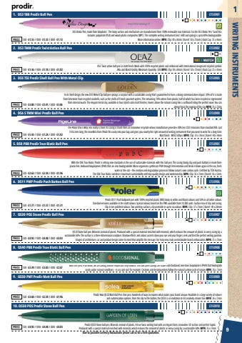 Due to possible currency fluctuations please call us for a firm quotation.9WRITING INSTRUMENTS1E150903In its Shell design, the new DS5 Metal Clip ball pen springs a surprise with a sustainable casing that%u2019s guaranteed to have a strong communicative impact. 30% of it is made from limestone from recycled seashells, such as the shells of French gourmet oysters. The remaining 70% comes from plastic, half of which has been recycled or regenerated from internal waste. The elegant metal clip, available in four stylish satin matt finishes, hovers above the natural casing like a surfboard riding the perfect wave. You can almost hear the roaring of the sea. MPA: 35 x 7mm3. DS5 TSE Prodir Shell Ball Pen With Metal ClipPRICE: 500 - %u00a33.80 / 1000 - %u00a33.41 / 3000 - %u00a33.06 E150909Prodir New QS50 Matt Ball Pen. One pen. Hundreds of ways to express what makes your brand unique. Available in a large variety of colours and customization options, from the clip to the button, the QS50 is an invitation to let creativity stream free. MPA: 36 x 7mm9. QS50 PMT Prodir Matt Ball PenPRICE: 500 - %u00a32.60 / 1000 - %u00a32.24 / 3000 - %u00a31.96 E150901DS3 Biotic Pen, made from Bioplastic. The body surface and mechanism are manufactured from 100% renewable raw materials. For the DS3 Biotic Pen %u2018Sand%u2019 this includes polyactide (PLA) and wood-plastic composites (WPC). The complete writing instrument (incl. refill and spring) is up to 80% biodegradable. More information online. MPA: Clip: 40 x 8mm | Barrel: 50 x 25mm | Back Cap: 25 x 4mm1. DS3 TBB Prodir Ball PenPRICE: 500 - %u00a31.55 / 1000 - %u00a31.32 / 3000 - %u00a31.12 E150910Prodir QS50 Stone ball pen. Minerals instead of plastic. A true Swiss writing tool with an elegant form, innovative 3D surface and perfect haptic. Produced with a special material enriched with minerals, which reduces the amount of plastic in every casing by a sustainable 60%. MPA: 35 x 7mm10. QS50 PQS Prodir Stone Ball PenPRICE: 500 - %u00a34.92 / 1000 - %u00a34.48 / 3000 - %u00a34.03 6. DS11 PMP Prodir Push Button Ball Pen E150906PRICE: 500 - %u00a31.77 / 1000 - %u00a31.57 / 3000 - %u00a31.31 Prodir DS11 Push ballpoint pen with 100% recycled plastic (ABS) body in white and Black colours and 50% in all other colours. Standard versions available in ten matt colours. Special colours based on the PMS available from 10,000 units. Surface mix of clip and casing. Clip in ten polished colours. Two printing surfaces, clip printable in up to six colours. MPA: Clip: 37 x 7mm | Barrel: 40 x 28mmE150904The Prodir DS6 S Mini, less really is more. Its casing is made from an innovative recyclate whose manufacture generates 40% less CO2 emissions than standard ABS. Just 124.6 mm long, the new Mini from Prodir fits easily into your bag and gives you exactly the right amount of writing instrument that you need to write for a long time. Matt finish. MOQ 500pcs. MPA: Clip: 33 x 7mm | Barrel: 40 x 4mm4. DS6 S TMM Mini Prodir Ball PenPRICE: 500 - %u00a31.43 / 1000 - %u00a31.24 / 3000 - %u00a31.02 E150902DS3 Twist action ball pen in matt finish. Made with 100% recycled plastic and embossed with International recognised recycled symbol. Mix and Match facility. Minimum Quantity: 500. MPA: Clip: 40 x 8mm | Barrel: 50 x 25mm | Back Cap: 25 x 4mm2. DS3 TMM Prodir Twist Action Ball PenPRICE: 500 - %u00a31.36 / 1000 - %u00a31.10 / 3000 - %u00a31.02 MIX&MATCHE150907QS20 Stone ball pen. Minerals instead of plastic. Produced with a special material enriched with minerals, which reduces the amount of plastic in every casing by a sustainable 60%. The surface is a three-dimensional sculpture. Shadow effects and colour accents draw your eye and your fingers seek and find the perfect writing position. Images of architecture, car and product design come to mind that amplify the message. For truly new, truly unmistakable brand ambassadors. MPA: 35 x 7mm7. QS20 PQS Stone Prodir Ball PenPRICE: 500 - %u00a34.92 / 1000 - %u00a34.48 / 3000 - %u00a34.03 E150908With the QS40 True Biotic, we are taking another important step forward. This ball pens casings are made from biobased, non-toxic biopolymers (PHA) that biodegrade easily under natural conditions - in sea and soil, for example. Creation and decomposition follow the natural carbon cycle of nature. MPA: 36 x 7mm8. QS40 PBB Prodir True Biotic Ball PenPRICE: 500 - %u00a33.39 / 1000 - %u00a33.02 / 3000 - %u00a32.67 E150905With the DS8 True Biotic, Prodir is setting new standards in the use of sustainable materials with this ball pen. The casing (body, clip and push button) is made from plastic-free, biobased biopolymers (PHA) that are also biodegradable. Micro-organisms synthesize PHA through fermentation and break it down again in the sea, fresh water or the soil %u2013 the creation and degradation processes follow nature%u2019s own carbon cycle. Certified by T%u00dcV Austria. The DS8 True Biotic combines maximum sustainability with top-quality design and workmanship. MPA: Clip: 36 x 7mm | Barrel: 36 x 5mm5. DS8 PBB Prodir True Biotic Ball PenPRICE: 500 - %u00a32.63 / 1000 - %u00a32.34 / 3000 - %u00a31.96