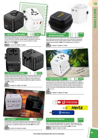 Due to possible currency fluctuations please call us for a firm quotation.91BAGS & TRAVEL10Made from 20% recycled materials. GAN is the latest technology in chargers providing fast and efficient charging. GAN enables adapters to be smaller and ideal for travel. Features 2 USB C ports and a USB A port for simultaneous charging. Supplied in a rigid, zipped case which can be printed. For use in sockets type A,B C,D E, F, G, H, I, J, K, L, N, & O. UKCA, CE, FC certified. MPA: 53 x 47 x 67 mm1. GAN 25W USB C Travel AdapterPRICE: 50 - %u00a315.13 / 100 - %u00a314.20 / 250 - %u00a313.57E159101Woven remove before flight tag, Woven within four main colours - different design to each side, 2.5mm merrow border and split ring (35mm) + metal eyelet, Size: 130mm x 30mm, Bulk packed. Available in a range of stock colours %u2013 please call for details. MPA: 130 x 30mm6. Remove Before Flight TagsPRICE: 100 - %u00a30.83 / 250 - %u00a30.67 / 500 - %u00a30.58E159106This BS8546-certified travel adapter is designed for safety and universal compatibility. Equipped with two USB-C ports and one USB-A port, it allows users to charge multiple devices simultaneously, from smartphones to laptops and more, all at optimal speeds. Robust construction and BS8546 certification ensure it meets the highest safety standards for worldwide use. With compatibility across more than 150 countries, this travel adapter provides seamless, reliable power access wherever you go. MPA: 40 x 25mm4. Flexiport Travel AdapterPRICE: 200 - %u00a330.36 / 300 - %u00a328.46 / 500 - %u00a326.62E159104BS8546 compliant world-wide travel adapter with USB C-PD fast charge port (18W) and USB A QC3 (quick charge). Power up your devices wherever you in no time. Features built in safety protection with lockable shutters and surges and spikes protection. Supplied in a rigid PU zipped travel case which can also be printed. RoHS, CE. MPA: 30 x 30 mm (below ports), 45 x 30 mm (case)2. Venture USB C/A Fast Charge Worldwide Travel AdapterPRICE: 50 - %u00a325.30 / 100 - %u00a323.68 / 250 - %u00a322.58E159102A compact charging solution designed for modern travellers. With advanced Gallium Nitride (GaN) technology, this adapter delivers efficient, high-speed charging. Features two USB-A ports and two USB-C ports, including one dedicated 35W USB-C port, enabling you to charge multiple devices simultaneously. To keep it secure and travel-ready, each adapter comes supplied in a durable EVA pouch. MPA: 35 x 20mm3. Zylo 35W GAN Travel AdapterPRICE: 250 - %u00a325.65 / 500 - %u00a324.01 / 1000 - %u00a322.44E159103This Travel Adapter is the perfect travel companion for any jet setter. Complete with UK, EU, USA, AUS adapters and 2 USB charging ports. Option to have USB-C port for additional cost. Supplied with a black pouch as standard with the option for this to be branded. MPA: 45mm x 22mm5. Travel AdapterPRICE: 100 - %u00a312.13 / 250 - %u00a311.19 / 500 - %u00a310.13E159105Wish you were here!Wish you were here!