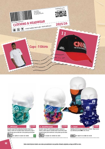 Unless stated all prices include a one colour personalisation in one position. Artwork, origination, carriage and VAT are extra. 92Caps %u00b7 T-Shirts## UK TRACKING ##UK PRIORITYRATE APPROVEDID: PROMO2025/2026(PROMOMERCH DEPT.)PLEASE HANDLE WITH CARE - OPEN CAREFULLYCLOTHING & HEADWEAR2025/26Code: 120866-31060918-261192Versatoob / Snood VT01 multifunctional headwear. Snood size is 500mm x 250mm polyester microfibre tubular material with an edge to edge full colour print on both sides. Can be printed up to full colour. MPA: All over2. Snood/VersatoobPRICE: 100 - %u00a33.54 / 250 - %u00a31.94 / 500 - %u00a31.72E159202Digiitally printed full colour multi-function headbands. 140gm material dye sublimation printed. MPA: 500 x 250 mm3. SnoodPRICE: 100 - %u00a32.27 / 250 - %u00a31.94 / 500 - %u00a31.72E159203Versatoob / Snood VT09 multifunctional headwear. Snood size is 500mm x 250mm rPET microfibre tubular material with an edge to edge full colour print on both sides. Can be printed up to full colour. MPA: All over1. rPET SnoodPRICE: 100 - %u00a33.78 / 250 - %u00a32.15 / 500 - %u00a31.93E159201
