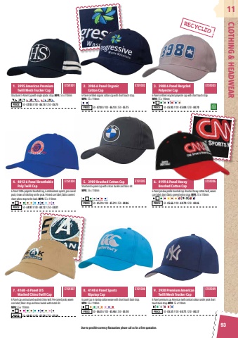 Due to possible currency fluctuations please call us for a firm quotation.93CLOTHING & HEADWEAR116 Panel certified organic cotton cap with short touch strap. MPA: 55 x 110mmStructured 6-panel cap with a brass buckle and brass slit. MPA: 55 x 110mm6 panel cap in ripstop cotton weave with short touch back strap. MPA: 55 x 110mmStructured 5-Panel Cap with single plastic strap. MPA: 55 x 110mm6 Panel 100% polyester baseball cap, 6 embroidered eyelets, pre-curved peak, 6 rows of stitching on the peak. Printed care label, fabric covered short velcro strap to the back. MPA: 55 x 110mm6 Panel cap unstructured washed chino twill. Pre-curved peak, woven care label, fabric strap and brass buckle with metal slit. MPA: 55 x 110mm6 Panel certified recycled polyester cap with short touch strap. MPA: 55 x 110mm6 Panel pro-low profile baseball cap. Brushed heavy cotton twill, woven care label, short fabric covered velcro strap. MPA: 55 x 110mm6 Panel premium cap American twill contrast colour under peak short touch back strap. MPA: 55 x 110mm2. 3986 6 Panel OrganicCotton Cap5. 3989 Brushed Cotton Cap8. 4148 6 Panel Sports Ripstop Cap1. 3995 American Premium Twill/Mesh Trucker Cap4. 4012 6 Panel BreathablePoly Twill Cap7. 4168 - 6 Panel U/S Washed Chino Twill Cap3. 3980 6 Panel RecycledPolyester Cap6. 4199 6 Panel HeavyBrushed Cotton Cap9. 3920 Premium American Twill/Mesh Trucker CapPRICE: 50 - %u00a37.03 / 100 - %u00a36.13 / 250 - %u00a35.75PRICE: 50 - %u00a35.74 / 100 - %u00a35.21 / 250 - %u00a34.86PRICE: 50 - %u00a36.35 / 100 - %u00a35.46 / 250 - %u00a35.10PRICE: 50 - %u00a37.03 / 100 - %u00a36.13 / 250 - %u00a35.75PRICE: 50 - %u00a34.97 / 100 - %u00a34.12 / 250 - %u00a33.81PRICE: 50 - %u00a36.43 / 100 - %u00a35.54 / 250 - %u00a35.18PRICE: 50 - %u00a35.92 / 100 - %u00a35.04 / 250 - %u00a34.70PRICE: 50 - %u00a35.66 / 100 - %u00a34.79 / 250 - %u00a34.46PRICE: 50 - %u00a35.57 / 100 - %u00a34.71 / 250 - %u00a34.37E159302E159305E159308E159301E159304E159307E159303E159306E159309