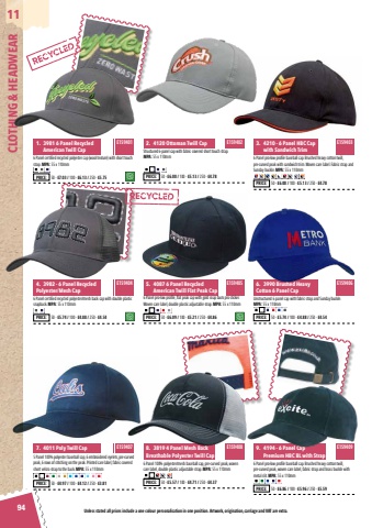 Unless stated all prices include a one colour personalisation in one position. Artwork, origination, carriage and VAT are extra. 94CLOTHING & HEADWEAR11Structured 6-panel cap with fabric covered short touch strap. MPA: 55 x 110mm6 Panel pro-low profile, flat peak cap with gold snap back pro sticker. Woven care label, double plastic adjustable strap. MPA: 55 x 110mm6 Panel 100% polyester/mesh baseball cap, pre-curved peak, woven care label, double plastic adjustable strap. MPA: 55 x 110mm6 Panel certified recycled polyester cap (wool texture) with short touch strap. MPA: 55 x 110mm6 Panel certified recycled polyester/mesh back cap with double plastic snapback. MPA: 55 x 110mm5 Panel 100% polyester baseball cap, 6 embroidered eyelets, pre-curved peak, 6 rows of stitching on the peak. Printed care label, fabric covered short velcro strap to the back. MPA: 55 x 110mm6 Panel pro-low profile baseball cap. Brushed heavy cotton twill, pre-curved peak with sandwich trim. Woven care label. Fabric strap and Sunday buckle. MPA: 55 x 110mmUnstructured 6 panel cap with fabric strap and Sunday buckle. MPA: 55 x 110mm6 Panel pro-low profile baseball cap. Brushed heavy cotton twill, pre-curved peak, woven care label, fabric strap and brass buckle with metal slit. MPA: 55 x 110mm2. 4120 Ottoman Twill Cap5. 4087 6 Panel Recycled American Twill Flat Peak Cap8. 3819 4 Panel Mesh Back Breathable Polyester Twill Cap1. 3981 6 Panel Recycled American Twill Cap4. 3982 - 6 Panel Recycled Polyester/Mesh Cap7. 4011 Poly Twill Cap3. 4210 - 6 Panel HBC Cap with Sandwich Trim6. 3990 Brushed Heavy Cotton 6 Panel Cap9. 4194 - 6 Panel Cap Premium HBC BL with StrapPRICE: 50 - %u00a36.00 / 100 - %u00a35.13 / 250 - %u00a34.78PRICE: 50 - %u00a36.09 / 100 - %u00a35.21 / 250 - %u00a34.86PRICE: 50 - %u00a35.57 / 100 - %u00a34.71 / 250 - %u00a34.37PRICE: 50 - %u00a37.03 / 100 - %u00a36.13 / 250 - %u00a35.75PRICE: 50 - %u00a35.74 / 100 - %u00a34.88 / 250 - %u00a34.54PRICE: 50 - %u00a34.97 / 100 - %u00a34.12 / 250 - %u00a33.81PRICE: 50 - %u00a36.00 / 100 - %u00a35.13 / 250 - %u00a34.78PRICE: 50 - %u00a35.74 / 100 - %u00a34.88 / 250 - %u00a34.54PRICE: 50 - %u00a36.86 / 100 - %u00a35.96 / 250 - %u00a35.59E159402E159405E159408E159401E159404E159407E159403E159406E159409