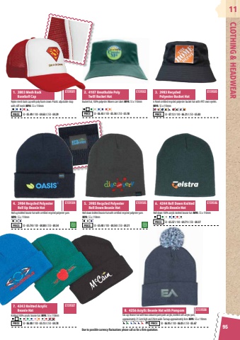 Due to possible currency fluctuations please call us for a firm quotation.95CLOTHING & HEADWEAR11Roll down knitted beanie hat with certified recycled polyester yarn. MPA: 55 x 110mmBucket hat, 100% polyester. Woven care label. MPA: 55 x 110mmKnitted 100% acrylic beanie hat. MPA: 55 x 110mmRoll up knitted beanie hat with certified recycled polyester yarn. MPA: 55 x 110mmNylon mesh back cap with poly foam crown. Plastic adjustable strap with stiff mesh. MPA: 55 x 110mmRoll down 100% acrylic knitted beanie hat. MPA: 55 x 110mm6 Panel certified recycled polyester bucket hat with rPET sewn eyelets. MPA: 55 x 110mm5. 3985 Recycled Polyester Roll Down Beanie Hat2. 4107 Breathable Poly Twill Bucket Hat7. 4243 Knitted Acrylic Beanie Hat4. 3984 Recycled Polyester Roll Up Beanie Hat1. 3803 Mesh Back Baseball Cap6. 4244 Roll Down Knitted Acrylic Beanie Hat3. 3983 Recycled Polyester Bucket HatPRICE: 50 - %u00a35.40 / 100 - %u00a34.54 / 250 - %u00a34.21PRICE: 50 - %u00a36.43 / 100 - %u00a35.54 / 250 - %u00a35.18PRICE: 50 - %u00a36.00 / 100 - %u00a35.13 / 250 - %u00a34.78PRICE: 50 - %u00a35.74 / 100 - %u00a34.88 / 250 - %u00a34.54PRICE: 50 - %u00a35.49 / 100 - %u00a34.63 / 250 - %u00a34.29PRICE: 50 - %u00a35.57 / 100 - %u00a34.71 / 250 - %u00a34.37PRICE: 50 - %u00a37.12 / 100 - %u00a36.21 / 250 - %u00a35.83E159505E159502E159507E159504E159501E159506E159503Ski cap Beanie hat with two coloured pom-pom acrylic, knitted soft acrylic yarn, approximately 21.5cm high and 20cm wide. Turnup approximately 8cm. MPA: 55 x 110mm8. 4256 Acrylic Beanie Hat with PompomPRICE: 50 - %u00a36.95 / 100 - %u00a36.05 / 250 - %u00a35.67E159508