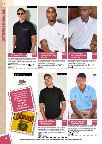 98CLOTHING & HEADWEAR11Embroidery showing 7500 stitches, please call for a quote for your logo to be embroidered. Artwork, origination, carriage and VAT are extra.KK455 Material: 100% polyester micro mesh. Textured fabric is moisture wicking allowing you to stay cool, dry and comfortable.1x1 ribbed collar. Self fabric taped neck. Three button placket. Twin needle sleeves and hem. Removable adhesive label. MPA: Varies - Please call for details. SIZE: XS - 3XLKK412 Material 65% polyester/35% cotton Jersey. Superwash 60 Jersey Polo Shirt. Regular Fit. Matching 1 x 1 rib flat collar & cuffs. Interlined slanted top placket. Tear out back neck label. MPA: Varies - Please call for details. SIZE: S - 2XLKK423 Material 65% Recycled polyester/35% cotton. Superwash 60 Pique Polo Shirt. Regular Fit. Matching 1 x 1 rib flat collar & cuffs. Two button straight top placket. Tear out back neck label. MPA: Varies - Please call for details. SIZE: S-3XL1. Kustom Kit Cooltex%u00ae Plus Micro Mesh Polo Shirt2. Kustom Kit Regular Fit Superwash%u00ae 60%u00b0C Jersey Polo Shirt3. Kustom Kit Recycled Poly/Cotton Superwash%u00ae 60%u00b0C Polo ShirtPRICE: 25 - %u00a313.07 PRICE: 25 - %u00a313.24 PRICE: 25 - %u00a315.39E159801 E159802E159705E159803KK460 Material: 100% ringspun combed cotton. Classic fit. 1x1 ribbed collar and cuffs .Taped neck and shoulder seams. Locker patch. Three button slanted placket. Side vents. Twin needle stitching. Tear out label. Superwash%u00ae 60%u00b0C. MPA: Varies - Please call for details. SIZE: XS - 3XL4. Kustom Kit 100% Cotton Klassic Superwash%u00ae 60%u00b0C Polo ShirtPRICE: 25 - %u00a317.11SS11 Material: 65% polyester/35% cotton. Ribbed collar and cuffs. Taped neck. Three self colour button placket. Reinforced shoulder seams. Twin needle stitching. Cut out label.60%u00b0C wash. Available in 20 colours. Larger sizes available. MPA: Varies - Please call for details. SIZE: S - 2XL5. Fruit of the Loom Poly/Cotton Pique Polo ShirtPRICE: 25 - %u00a310.66E159804 E159805All garments on page 98 & 99 have been priced with 7500 stitches of embroidery in one position, artwork and origination extra.PLEASE CALL for a quote for your logo to be embroidered.