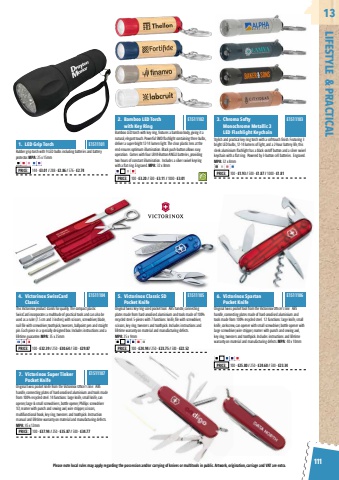 111LIFESTYLE & PRACTICAL13Please note local rules may apply regarding the possession and/or carrying of knives or multitools in public. Artwork, origination, carriage and VAT are extra.Original Swiss pocket knife from the Victorinox Officer%u2019s line: ABS handle, connecting plates of hard-anodised aluminium and tools made from 100% recycled steel. 14 functions: large knife, small knife, can opener, large & small screwdrivers, bottle opener, Phillips screwdriver 1/2, reamer with punch and sewing awl, wire stripper, scissors, multifunctional hook, key ring, tweezers and toothpick. Instruction manual and lifetime warranty on material and manufacturing defects. MPA: 45 x 12mmBamboo LED torch with key ring, features a bamboo body, giving it a natural, elegant touch. Powerful SMD flashlight containing three bulbs, deliver a super-bright 12-14 lumen light. The clear plastic lens at the end ensures optimum illumination. Black push-button allows easy operation. Comes with four LR44-Button ANGLI batteries, providing two hours of constant illumination. Includes a silver swivel keyring with a flat ring. Engraved. MPA: 32 x 8mmRubber grip torch with 9 LED bulbs including batteries and battery protector. MPA: 25 x 15mmStylish and practical key ring torch with a soft-touch finish. Featuring 3 bright LED bulbs, 12-14 lumens of light, and a 2-hour battery life, this sleek aluminium flashlight has a black on/off button and a silver swivel keychain with a flat ring. Powered by 3-button cell batteries. Engraved. MPA: 32 x 8mm7. Victorinox Super Tinker Pocket Knife2. Bamboo LED Torchwith Key Ring1. LED Grip Torch3. Chroma Softy Monochrome Metallic 3 LED Flashlight KeychainPRICE: 100 - %u00a33.20 / 500 - %u00a33.11 / 1000 - %u00a33.01PRICE: 144 - %u00a33.01 / 288 - %u00a32.86 / 576 - %u00a32.74 PRICE: 100 - %u00a31.93 / 500 - %u00a31.87 / 1000 - %u00a31.81PRICE: 100 - %u00a337.94 / 250 - %u00a335.87 / 500 - %u00a334.77E1511107E1511102E1511101E1511103This Victorinox product stands for quality. The compact plastic SwissCard incorporates a multitude of practical tools and can also be used as a ruler (7.5 cm and 3 inches), with scissors, screwdriver, blade, nail file with screwdriver, toothpick, tweezers, ballpoint pen and straight pin. Each piece in a specially designed box. Includes instructions and a lifetime guarantee. MPA: 35 x 25mmOriginal Swiss key ring sized pocket tool. ABS handle, connecting plates made from hard-anodised aluminium and tools made of 100% recycled steel. 5-pieces with 7 functions: knife, file with screwdriver, scissors, key ring, tweezers and toothpick. Includes instructions and lifetime warranty on material and manufacturing defects. MPA: 25 x 9mmOriginal Swiss pocket tool from the Victorinox Officer%u2019s line: ABS handle, connecting plates made of hard-anodised aluminium and tools made from 100% recycled steel. 12 functions: large knife, small knife, corkscrew, can opener with small screwdriver, bottle opener with large screwdriver, wire stripper, reamer with punch and sewing awl, key ring, tweezers and toothpick. Includes instructions and lifetime warranty on material and manufacturing defects. MPA: 40 x 10mm4. Victorinox SwissCard Classic5. Victorinox Classic SD Pocket Knife6. Victorinox Spartan Pocket KnifePRICE: 100 - %u00a332.39 / 250 - %u00a330.64 / 500 - %u00a329.87PRICE: 100 - %u00a325.80 / 250 - %u00a324.60 / 500 - %u00a323.34E1511104 E1511105 E1511106PRICE: 100 - %u00a324.94 / 250 - %u00a323.75 / 500 - %u00a322.52T T T