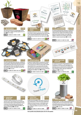 Due to possible currency fluctuations please call us for a firm quotation.119PLANTS & SEEDS15Fully customised wrap round, one side, biodegradable wood fibre pot, x4 coir pellets, x5 seedsticks, with flower, vegetable, herb or tree seeds. MPA: 70 x 74 x 49mmThis registered trademarked product evolved from a matchbook over 30 years ago with the striking end being replaced by seed! Seedsticks can be printed full colour, inside and out, using veg and soy inks on certified paper. Made in Britain and certified with a wide range of flower, vegetable, herb and tree seeds available. Tear it, plant it and watch it grows. MPA: 99 x 67mmFor awareness campaigns and special events, an eco-friendly alternative to plastic. Instead of throwing away the wristband after the event, the lucky recipient can plant it to grow flowers. The piece is taken home and saved, giving longer brand interaction with the user. Standard is white paper embedded with wildflower seed, printed one side full colour. MPA: 240 x 20mmBeautifully pre-printed packs of seeds, with a choice of wildflower or herb seeds. We can add your logo/branding onto a gloss sticker making it a great sustainable promotional product. Each pack is foil sealed with a gloss finish and contains loose seeds ready for planting. MPA:35 x 35mmAn industry first, Rainball SeedBoxes! Box branded with a full-colour label. The box is made from recycled card and can be recycled after use. Short lead times (up to 1000 units). Each box contains 3 vibrantly coloured Rainballs that are so easy to grow. Includes instructions inside. Simply soak and scatter them under the soil and watch them grow. Made in the UK. Constructed from post-consumer recycled paper and filled with mixed wildflower seeds. MPA: 50 x 50mmPlantable coasters grow wildflowers when planted in soil. These seed paper promotional items are made with seed paper embedded with wildflower seeds. Choose from square or circular plantable coasters and customise with options to suit your needs. Standard is white paper embedded with wildflower seed, printed one side full colour.MPA: 89 x 89mmThis registered trademarked product evolved from a matchbook over 30 years ago with the striking end being replaced by seed! Express Seedsticks come with a standard card case with fully customisable labels that can be printed in full colour and are available with wildflower or mixed herb seeds. The product is Made in Britain certified. Tear it, plant it and watch it grow. MPA: 35 x 35mmBe remembered for this unique and green promotional item. Perfect for handing out at tradeshows or as a gift of appreciation, seed promotional items such as bookmarks grow into wildflowers when planted. Made with post-consumer waste and are printed according to your specifications. Standard is white paper embedded with wildflower seed. MPA: 50 x 210mmDesktop Tube Gardens - 42 x 102mm - Recycled brushed aluminium, the desktop garden pot can be reused again and again. Complete with twisting lid, growing instructions, seedsticks and organic soil coin (x3) with a full colour label. Available with wildflowers or mixed herbs seeds. MPA: 144 x 23mm1. Bio Pot Gardens4. Bee Seedsticks%u00ae7. Seeded Paper Wristbands2. Essentials Seed Packets5. Rainball Seedboxes8. Seeded Paper Medium Coasters3. Essentials Seedsticks%u00ae6. Seeded Paper Small Bookmarks9. Desktop Tube GardensPRICE: 50 - %u00a314.26 / 100 - %u00a37.93 / 250 - %u00a34.75PRICE: 250 - %u00a34.59 / 500 - %u00a32.67 / 1000 - %u00a31.75PRICE: 100 - %u00a33.37 / 250 - %u00a32.54 / 500 - %u00a32.27PRICE: 100 - %u00a32.18 / 250 - %u00a31.97 / 500 - %u00a31.49PRICE: 50 - %u00a32.58 / 100 - %u00a32.12 / 250 - %u00a32.01PRICE: 100 - %u00a32.94 / 250 - %u00a31.07 / 500 - %u00a30.84PRICE: 100 - %u00a32.13 / 250 - %u00a31.87 / 500 - %u00a31.44PRICE: 100 - %u00a32.61 / 250 - %u00a31.39 / 500 - %u00a31.05PRICE: 50 - %u00a34.88 / 100 - %u00a34.28 / 250 - %u00a33.69E1511901E1511904E1511907E1511902E1511905E1511908E1511903E1511906E1511909