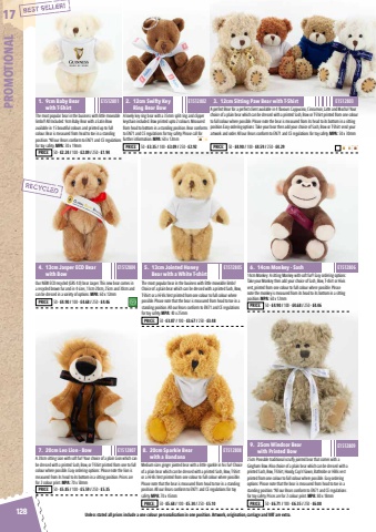Unless stated all prices include a one colour personalisation in one position. Artwork, origination, carriage and VAT are extra. 128PROMOTIONAL17A perfect Bear for a perfect client available in 4 flavours Cappucino, Cinnamon, Latte and Mocha! Your choice of a plain bear which can be dressed with a printed Sash, Bow or T-Shirt printed from one colour to full colour where possible. Please note the bear is measured from its head to its bottom in a sitting position.Easy ordering options: Take your bear then add your choice of Sash, Bow or T-Shirt send your artwork and order. All our Bears conform to EN71 and CE regulations for toy safety. MPA: 50 x 30mm3. 12cm Sitting Paw Bear with T-ShirtPRICE: 50 - %u00a34.90 / 100 - %u00a34.59 / 250 - %u00a34.29E1512803A lovely key ring bear with a 35mm split ring and clipper keychain included. Bow printed upto 2 colours. Measured from head to bottom in a standing position. Bear conforms to EN71 and CE regulations for toy safety. Please call for further information. MPA: 60 x 12mm2. 12cm Swifty Key Ring Bear BowPRICE: 50 - %u00a33.35 / 100 - %u00a33.09 / 250 - %u00a32.92E1512802 The most popular bear in the business with little moveable limbs! Choice of a plain bear which can be dressed with a printed Sash, Bow, T-Shirt or a Hi-Vis Vest printed from one colour to full colour where possible. Please note that the bear is measured from head to toe in a standing position. All our Bears conform to EN71 and CE regulations for toy safety. MPA: 40 x 25mm5. 13cm Jointed Honey Bear with a White T-shirtPRICE: 50 - %u00a33.87 / 100 - %u00a33.67 / 250 - %u00a33.48E151280514cm Monkey: A sitting Monkey with soft fur!! Easy ordering options: Take your Monkey then add your choice of Sash, Bow, T-shirt or Hivis vest, printed from one colour to full colour where possible. Please note the monkey is measured from its head to its bottom in a sitting position. MPA: 60 x 12mm6. 14cm Monkey - SashPRICE: 50 - %u00a34.90 / 100 - %u00a34.68 / 250 - %u00a34.46E151280625cm Poseable traditional scruffy jointed bear that comes with a Gingham Bow. Also choice of a plain bear which can be dressed with a printed Sash, Bow, T-Shirt, Hoody, Cap%u2019n%u2019Gown, Bathrobe or HiVis vest printed from one colour to full colour where possible. Easy ordering options: Please note that the bear is measured from head to toe in a standing position. *All our Bears conform to EN71 and CE regulations for toy safety. Prices are for 2 colour print. MPA: 80 x 18mm9. 25cm Windsor Bear with Printed BowPRICE: 50 - %u00a36.71 / 100 - %u00a36.35 / 250 - %u00a36.08E1512809The most popular bear in the business with little moveable limbs!! All Included: 9cm Baby Bear with a Satin Bow available in 15 beautiful colours and printed up to full colour. Bear is measured from head to toe in a standing position. *All our Bears conform to EN71 and CE regulations for toy safety. MPA: 30 x 19mm1. 9cm Baby Bear with T-ShirtPRICE: 50 - %u00a32.24 / 100 - %u00a32.09 / 250 - %u00a31.94E15128012. Medium Seed Packet GlossPRICE: 50 - %u00a35.68 / 100 - %u00a35.34 / 250 - %u00a35.10Medium sizes ginger jointed bear with a little sparkle in his fur! Choice of a plain bear which can be dressed with a printed Sash, Bow, T-Shirt or a Hi-Vis Vest printed from one colour to full colour where possible. Please note that the bear is measured from head to toe in a standing position. All our Bears conform to EN71 and CE regulations for toy safety. MPA: 70 x 45mm8. 20cm Sparkie Bear E1512808A 20cm sitting Lion with soft fur! Your choice of a plain Lion which can with a Bandanabe dressed with a printed Sash, Bow, or T-Shirt printed from one to full colour where possible. Easy ordering options: Please note the lion is measured from its head to its bottom in a sitting position. Prices are for 2 colour print. MPA: 70 x 50mm7. 20cm Leo Lion - BowPRICE: 50 - %u00a35.85 / 100 - %u00a35.59 / 250 - %u00a35.35E1512807Our NEW ECO recycled (GRS 4.0) bear Jasper. This new bear comes in a recycled brown fur and in 4 sizes, 13cm 20cm, 25cm and 30cm and can be dressed in a variety of options. MPA: 60 x 12mm4. 13cm Jasper ECO Bear with BowPRICE: 50 - %u00a34.90 / 100 - %u00a34.68 / 250 - %u00a34.46E1512804