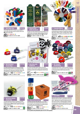 Due to possible currency fluctuations please call us for a firm quotation.129PROMOTIONAL17Soft foam Spider Flyer, safe to use indoors and out! Available in a range of colours with options to print on all panels and the centre.MPA: 50mm, 10mm, 20mmThe stickable promotional giveaway not throwaway. All included: Recycled yarn, feet and eyes so 95% recycled and ready to use. Easy to order just pick your ANIMAL BUG (Bee, Ladybird, Frog, Hedgehog or Snail) , and feet colour.MPA: 75 x 17mmThe stickable promotional giveaway not throwaway. All included: Pom, feet, hat and eyes ready to use. Easy to order, pick your BUG colour then your FEET colour, your Hat style (Police, Fireman, Traffic Cop & New Police Hat) and send with your artwork and order.MPA: 75 x 17mmA magnetic mini marker bookmark where the top 3rd folds over and is held closed by 2 small magnets. Digitally printed up to full colour both sides and includes lamination both sides. MPA: 40 x 95mmA small foam cube puzzle called Snafooz which comes in a flat frame and includes 6 sides of printing. Remove the pieces from the frame and build a cube. Once built why not try and place the pieces back into the frame. Price includes full colour print.MPA: 23 x 23mmThe alternative collectable bookmark ready for any read!! All included: Your choice of character and foam colour printed with an animal body up to full colour onto 300gsm gloss card and all made in the UK.MPA: 35 x 45mmCharity awareness ribbons in wide range of colours are an ideal way of raising both funds and awareness for any great cause. Numerous ribbon colours available; each with a small gold safety pin. Supplied pinned ready for use. Satin ribbon can be printed in up to 2 colours - included in price.MPA: 40 x 12mmIdeal direct mail item to help your next promotion really take off! Brilliant foam flyer that comes in a great selection of mix & match colours - simply choose one colour for the body and one for the wings and tail. Each plane is individually bagged for distribution ease, and just needs a penny (not included) slotted into the nose to start flying high! Price includes Full colour print to the wings and tail. MPA: 65 x 35mm / 25 x 27mmThis appealing hamper features a selection of luxurious, yet practical, seasonal treats and is our most popular Christmas hamper. Presented in a 16%u201d paper rope hamper basket and outer postal carton.MPA: 75 x 17mm1. Mini Spider Flyer7. AB2 British Wildlife Animal Bugs4. GB3 Emergency Services Bugs2. Magnetic Mini Marker Bookmark8. 38mm (small) Snafooz5. BB4 Billbo Body Bookmarks3. Campaign Ribbons9. Foam Glider6. GB1 Recycled Standard BugsPRICE: 100 - %u00a31.38 / 250 - %u00a31.17 / 500 - %u00a30.97PRICE: 100 - %u00a30.60 / 250 - %u00a30.50 / 500 - %u00a30.41PRICE: 100 - %u00a30.60 / 250 - %u00a30.50 / 500 - %u00a30.37PRICE: 100 - %u00a30.55 / 500 - %u00a30.42 / 1000 - %u00a30.36PRICE: 100 - %u00a31.89 / 250 - %u00a31.67 / 500 - %u00a31.46PRICE: 100 - %u00a30.57 / 250 - %u00a30.47 / 500 - %u00a30.37PRICE: 100 - %u00a30.41 / 250 - %u00a30.32 / 500 - %u00a30.26PRICE: 100 - %u00a31.55 / 250 - %u00a31.34 / 500 - %u00a31.13PRICE: 100 - %u00a30.45 / 250 - %u00a30.35 / 500 - %u00a30.31E1512901E1512907E1512904E1512902E1512908E1512905E1512903E1512909E1512906