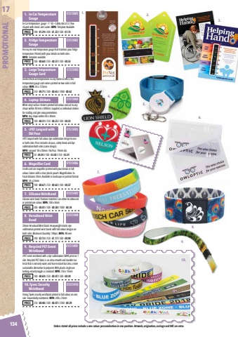 Unless stated all prices include a one colour personalisation in one position. Artwork, origination, carriage and VAT are extra. 134PROMOTIONAL17In-Car temperature gauge - 5%u00b0-50 + Safety dot at 52. Paw shaped with elastic and sucker. MPA: Template Available.1. In Car Temperature GaugePRICE: 100 - %u00a31.29 / 200 - %u00a31.22 / 500 - %u00a31.13E1513401An easy to read temperature gauge that monitors your fridge temperature. Printed with your details on both sides.MPA: Template available.2. Fridge Temperature GaugePRICE: 100 - %u00a30.60 / 250 - %u00a30.57 / 500 - %u00a30.53E1513402Useful check on temperatures in any home or office, thistemperature gauge card comes printed on two sides in full colour. MPA: 85 x 125mm3. Large Temperature Gauge CardPRICE: 250 - %u00a30.71 / 500 - %u00a30.65 / 1000 - %u00a30.62E1513403White vinyl surface stickers printed full colour and cut to any shape within 40 mm x 840mm. Supplied as individual stickers for mailing and give away promotions.MPA: Any shape within 40 x 40mm4. Laptop StickersPRICE: 100 - %u00a30.31 / 250 - %u00a30.25 / 500 - %u00a30.23E15134042. 1.4.5.6.7.8.9.3.rPET lanyard with full colour dye sublimation design to one or both sides. Price includes ski pass, safety break and dye sublimation both sides (same design).MPA: Lanyard: 90 x 20mm / Ski Pass: 19mm dia.5. rPET Lanyard with Ski PassPRICE: 50 - %u00a34.01 / 100 - %u00a33.42 / 250 - %u00a33.21E1513405Credit card size magnifier printed with your details in full colour. Comes with a clear plastic pouch. Magnification 3x. Focal distance 20cm. Available in landscape or portrait format.MPA: 54 x 23mm6.%u0009 Magnifier CardPRICE: 100 - %u00a30.67 / 250 - %u00a30.62 / 500 - %u00a30.57E1513406Silicone wrist band. Pantone matched. Can either be debossed or printed one colour. MPA: 180 x 8mm7. Silicone WristbandPRICE: 300 - %u00a30.41 / 500 - %u00a30.38 / 1000 - %u00a30.34E151340720mm Versaband Wrist Band. Heavyweight elastic dye sublimation printed wrist bands with full colour designs on both sides. Minimum Quantity: 100pcs. MPA: All over8. Versaband Wrist BandPRICE: 100 - %u00a32.13 / 250 - %u00a31.17 / 500 - %u00a30.94E1513408rPET event wristband with a dye sublimation CMYK print on 1 side. Recycled PET fabric is an ultra-smooth and durable material that is not only water and tear-resistant but also a more sustainable alternative to polyester. With plastic single-use locking security toggle as standard. MPA: 350 x 15mm9. Recycled PET Event WristbandPRICE: 100 - %u00a30.69 / 250 - %u00a30.47 / 500 - %u00a30.39E1513409Strong Tyvek security wristband printed in full colour on one side. Sequentially numbered. MPA: 208 x 25mm10. Tyvec Security WristbandPRICE: 250 - %u00a30.48 / 500 - %u00a30.47 / 2500 - %u00a30.29E151341010.