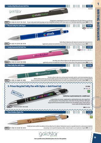 Due to possible currency fluctuations please call us for a firm quotation.19WRITING INSTRUMENTS1E151901Equipped with a smooth ballpoint mechanism, the Crosby Monochrome Pen glides effortlessly across the page. The pen%u2019s matte painted metallic tips, plunger, and clip, all thoughtfully matching the barrel%u2019s colour, exude an air of understated sophistication. Engraved. MPA: 90 x 7mm1. Crosby Softy Monochrome Ball PenPRICE: 100 - %u00a31.30 / 500 - %u00a31.27 / 1000 - %u00a31.23E151902Tactile soft-touch ballpoint pen with rubberised aluminium barrel and gunmetal trim. Supplied with a premium Eversmooth elite German ink refill with a choice of blue or black writing ink. Engraved. MPA: 47 x 7mm2. Phoenix Softy Pen with StylusPRICE: 100 - %u00a31.27 / 500 - %u00a31.23 / 1000 - %u00a31.19 E151904The tactile, soft-touch rubber barrel and handy stylus functionality make this a much desired promotional stylus pen. With the chrome accented rings and your beautifully engraved personalised message this is one promotional pen that%u2019s going to get your brand Noticed! You can also customise it using ColourJet, our full-colour digital imprint process that makes it easy to show your brand%u2019s true colours. Engraved. MPA: 50 x 7mm4. Prince Softy Pen with StylusPRICE: 100 - %u00a31.01 / 500 - %u00a30.98 / 1000 - %u00a30.95 E151905Crafted from recycled aluminium for a mindful touch.Its refined chrome trim and tops, complemented by a sophisticated black stylus, add an elegant flair to your writing experience. The tips and tops feature a shiny chrome UV coating, enhancing its stylish appeal. Equipped with Anti-Fraud Documental Blue and Black Ink and a slim refill with a precise 1.0mm tip, this pen ensures smooth and reliable writing. Engraved.MPA: 56 x 7mm5. Prince Recycled Softy Pen with Stylus + Anti-Fraud InkPRICE: 100 - %u00a31.56 / 500 - %u00a31.51 / 1000 - %u00a31.473. Crosby Gunmetal Soft Ball Pen E151903PRICE: 100 - %u00a31.10 / 500 - %u00a31.07 / 1000 - %u00a31.04 Best-selling, tactile, soft-touch ballpoint pen with rubberised aluminium barrel and shiny chrome trim. Supplied with a premium Eversmooth elite German ink refill with a choice of blue or black writing ink. Engraved. MPA: 50 x 7mmE151906Promote your business with the new addition to the best-selling Prince Pen collection. Bamboo barrel sourced via responsible forestry for an earthy look and smooth feel, and your logo is laser engraved for long-lasting visibility. Convenient stylus for use on touchscreens. Engraved. MPA: 50 x 7mm6. Prince Bamboo Stylus PenPRICE: 100 - %u00a31.63 / 500 - %u00a31.58 / 1000 - %u00a31.53