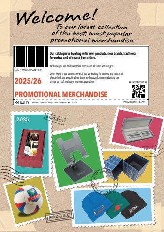 2025## UK TRACKING ##PLEASE HANDLE WITH CARE - OPEN CAREFULLY (PROMOMERCH DEPT.)PROMOTIONAL MERCHANDISE2025/26Code: 120866-31060918-26Our catalogue is bursting with new products, new brands, traditional favourites and of course best sellers.We know you will find something here to suit all tastes and budgets.Don%u2019t forget, if you cannot see what you are looking for or need any help at all, please check our website where there are thousands more products to see or give us a call to discuss your next promotion!Welcome! To our latest collection of the best, most popular promotional merchandise.