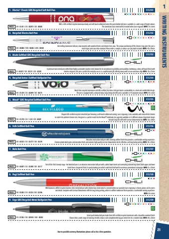Due to possible currency fluctuations please call us for a firm quotation.21WRITING INSTRUMENTS1E152101With a GRS certified recycled aluminium body and soft touch rubberised outer, this push-button ball pen is available in a wide range of bright colours. The aluminium base metal will be revealed when laser engraved. MPA: 50 x 6mm1. Electra%u00ae Classic GRS Recycled Soft Ball PenPRICE: 100 - %u00a31.41 / 250 - %u00a30.97 / 500 - %u00a30.84 E152108Well balanced, softfeel recycled stainless steel, metal ball pen with chrome base metal which is revealed when our specialist laser engraving is chosen, please ask for prices and details. Complete with German Dokumental refill for long lasting writing, whilst its softfeel rubberised finish provides a comfortable writing experience. MPA: 40 x 6mm8. Pegi Softfeel Ball PenPRICE: 100 - %u00a33.83 / 250 - %u00a33.25 / 500 - %u00a32.96E152102Best-selling aluminium ball pen, now recycled, with anodised finish and chrome trim, now . The unique positioning of the chrome rings gives this pen a much larger print area than standard. Please order a sample as colours can vary batch to batch. MPA: 40 x 20mm2. Recycled Electra Ball PenPRICE: 500 - %u00a30.88 / 1000 - %u00a30.85 / 2000 - %u00a30.83E152106Attractive, twist-action ball pen with stunning softfeel finish that provides a comfortable writing experience. Chrome plated which gives and executive finish and contains high-quality German Dokumental ink for effortless and long-lasting writing. MPA: 40 x 20mm6. Folk Softfeel Ball PenPRICE: 100 - %u00a34.32 / 250 - %u00a33.71 / 500 - %u00a33.39E152109Smart push-button ball pen made from GRS certified recycled aluminium with a beautiful anodised finish. Choose from a wide range of stunning metallic colours, each complemented by gun metal trim for a modern look. MPA: 40 x 20mm9. Ergo GRS Recycled Metal Ballpoint PenPRICE: 250 - %u00a31.05 / 500 - %u00a30.94 / 1000 - %u00a30.85E152105Elegant GRS certified recycled metal ball pen featuring a soft-touch rubberised coating. Laser engraving is also available, with mirror-finish chrome to match the polished chrome trim. Designed as a perfect match for the Mood%u2122 notebook, (see page 66) available in 23 different colours. Registered design. Includes long life refill with German Dokumental ink. MPA: 50 x 20mm5. Mood%u00ae GRS Recycled Softfeel Ball PenPRICE: 100 - %u00a31.79 / 250 - 1.25 / 500 - %u00a30.873. Blade Softfeel GRS Recycled Ball Pen E152103PRICE: 50 - %u00a34.47 / 100 - %u00a33.31 / 250 - %u00a32.83A premium twist metal pen crafted from highly sustainable stainless steel, known for its exceptional recyclability and durability. Combining a sleek, soft-touch finish with timeless elegance, this pen is perfect for everyday use or as a sophisticated gift, offering luxury with an eco-conscious edge. MPA: 30 x 25mmE152107Part of the Chili Concept range - the Nolo ball pen is an attractive, twist-action ball pen with a white lower barrel and contrasting coloured top barrel, both upper and lower barrel have a lacquered finish. A sporty looking pen which could lend itself well to numerous promotional campaigns. MPA:35 x 20mm7. Nolo Ball PenPRICE: 100 - %u00a34.07 / 250 - %u00a33.48 / 500 - %u00a33.17E152104Made from recycled aluminium and GRS certified, the Astra-i ball pen boasts sustainability in a sleek and comfortable design. The pen is equipped with a coloured stylus, long lasting ink-refill and is available in 19 corporate colours. MPA: 40 x 6mm4. Recycled Astra-i Softfeel Ballpoint PenPRICE: 100 - %u00a31.29 / 250 - %u00a30.89 / 500 - %u00a30.73