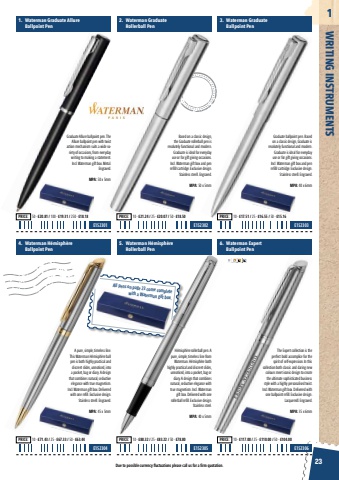 Due to possible currency fluctuations please call us for a firm quotation.23WRITING INSTRUMENTS1E152301E152304E152302E152305E152303E152306Graduate Allure ballpoint pen. The Allure ballpoint pen with twist action mechanism suits a wide variety of occasions, from everyday writing to making a statement. Incl. Waterman gift box. Metal. Engraved. MPA: 50 x 5mmA pure, simple, timeless line. This Waterman H%u00e9misph%u00e8re ball pen is both highly practical and discreet slides, unnoticed, into a pocket, bag or diary. A design that combines natural, seductive elegance with true magnetism. Incl. Waterman gift box. Delivered with one refill. Exclusive design. Stainless steell. Engraved. MPA: 45 x 5mmBased on a classic design, the Graduate rollerball pen is resolutely functional and modern. Graduate is ideal for everyday use or for gift giving occasions. Incl. Waterman gift box and pen refill/ cartridge. Exclusive design. Stainless steell. Engraved. MPA: 50 x 5mmH%u00e9misph%u00e8re rollerball pen. A pure, simple, timeless line from Waterman. H%u00e9misph%u00e8re both highly practical and discreet slides, unnoticed, into a pocket, bag or diary. A design that combines natural, seductive elegance with true magnetism. Incl. Waterman gift box. Delivered with one rollerball refill. Exclusive design. Stainless steel. MPA: 40 x 5mmAll pens on page 23 come complete with a Waterman gift box.Graduate ballpoint pen. Based on a classic design, Graduate is resolutely functional and modern. Graduate is ideal for everyday use or for gift giving occasions. Incl. Waterman gift box and pen refill/ cartridge. Exclusive design. Stainless steell. Engraved. MPA: 40 x 6mmThe Expert collection is the perfect bold accomplice for the spirit of self-expression. In this collection both classic and daring new colours meet iconic design to create the ultimate sophisticated business style with a highly personalised twist. Incl. Waterman gift box. Delivered with one ballpoint refill. Exclusive design. Lacqueredl. Engraved. MPA: 35 x 6mm1. Waterman Graduate Allure Ballpoint Pen4. Waterman H%u00e9misph%u00e8re Ballpoint Pen2. Waterman GraduateRollerball Pen5. Waterman H%u00e9misph%u00e8re Rollerball Pen3. Waterman Graduate Ballpoint Pen6. Waterman Expert Ballpoint PenPRICE: 50 - %u00a320.81 / 100 - %u00a319.31 / 250 - %u00a318.18 PRICE: 10 - %u00a371.43 / 25 - %u00a367.33 / 50 - %u00a363.44 PRICE: 10 - %u00a321.24 / 25 - %u00a320.07 / 50 - %u00a318.50 PRICE: 10 - %u00a388.32 / 25 - %u00a383.22 / 50 - %u00a378.80 PRICE: 10 - %u00a317.51 / 25 - %u00a316.55 / 50 - %u00a315.16 PRICE: 10 - %u00a3117.00 / 25 - %u00a3110.00 / 50 - %u00a3104.00E & DURY ACCOUNTANTS