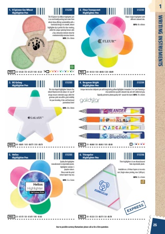 Due to possible currency fluctuations please call us for a firm quotation.25WRITING INSTRUMENTS1E152501E152503E152505The H-Spinner Eco Wheat Highlighter pen is an eco-friendly writing tool made from wheat straw, offering sustainability with a functional design. Its smooth, vibrant highlighter tip is perfect for clear marking, while the unique spinning feature adds a fun, interactive element. Ideal for environmentally-conscious brands. MPA: 20 x 20mmThis star-shaped highlighter features five vibrant fluorescent ink colours. Its %u2018cap off%u2019 design ensures extended usage, while the generous print area offers great visibility for your branding. A fun and functional promotional item!MPA: 30 x 30mmQuality flat highlighter manufactured in imprintable plastic. Highlighter contains 5 popular colours. Please note the petal colour layout may vary.MPA: 55 x 55mmFlower shaped highlighter with different coloured inks. MPA: 40 x 40mmUnique twist-action ballpoint pen with long-lasting yellow highlighter. Innovative 2-in-1 pen featuring a clear protective cap with coloured clip and soft rubberised grip. Digitally printed to photo-quality 360%u00b0 around the barrel. MPA: 70 x 36mmThree highlighters in one. Manufactured from imprintable plastic. Available on a 24-Hour Express at no extra cost. (Single colour printing, max 5,000 pcs). MPA: 35 x 35mm1. H Spinner Eco Wheat Highlighter Pen3. BG Galaxy Highlighter Pen5. Helios Highlighter Pen2. Fleur Transparent Highlighter Pen4. Bergman Bright Highlighter Pen6. TriangularHighlighter PenPRICE: 350 - %u00a31.32 / 700 - %u00a31.27 / 1400 - %u00a31.22 PRICE: 400 - %u00a30.81 / 1600 - %u00a30.77 / 3200 - %u00a30.75 PRICE: 250 - %u00a31.17 / 500 - %u00a31.07 / 1000 - %u00a31.02 PRICE: 200 - %u00a31.12 / 1000 - %u00a30.92 / 5000 - %u00a30.89 PRICE: 250 - %u00a30.88 / 500 - %u00a30.85 / 1000 - %u00a30.83 PRICE: 100 - %u00a31.22 / 250 - %u00a30.77 / 500 - %u00a30.70 E152502E152504E152506THE %u2018TEN-PIN%u2019 AGENCY