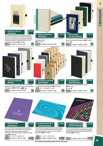 Due to possible currency fluctuations please call us for a firm quotation.65NOTEBOOKS7E156501E156504E156507E156502E156505E156508E156503E156506E156509Eco A5 notebook made from grass fibre (up to 40% content) onto a recycled card board. Recycled rPET elastic and 96 lined recycled paper pages. Pages are sustainable organic eco-friendly paper with following environmental characteristics: acid and chlorine free, free of heavy metals, recyclable, compostable. MPA: 150 x 80mmEco A5 notebook made from recycled plastic 600d rPET fabric. Ribbon and black elastic closure and pen loop. 96 sheets of lined recycled 70gsm cream paper pages. MPA: 150 x 80mmA5 Flexi Eco notebook with recycled post consumer card covers in 14 vibrant colours, rounded corners and 80 sheets of environmentally friendly white lined paper from sustainable managed forests. Manufactured in the UK. 100% recyclable. Also available in A4 and A6 formats. MPA: 148 x 210mmEco Notebook made from sugarcane with rPET accessories. Paper made from sugarcane, no trees. MPA: 150 x 80mmA5 notebook made from Recycled Kraft paper cover with rPET elastic. 96 pages of recycled cream lined 70gsm paper. MPA: 110 x 80mmA5 flexi notebook in a landscape format with post consumer recycled card cover in a great range of colours. 80 sheets of environmentally friendly white lined paper and rounded corners. 100% recyclable. Made in the UK. MPA: 210 x 148mmEco A5 notebook with a recycled 3oz cotton cover with rPET elastic. 96 pages of recycled cream lined 70gsm paper. MPA: 110 x 80mmNotebook made from recycled PU with recycled paper. MPA: 150 x 80mmA5 flexi full colour notebook printed on white gloss card cover with a matt laminate finish. 80 sheets of environmentally friendly white lined paper and rounded corners. Made in the UK. A6 and A4 size also available. MPA: 148 x 210mm1. Iwade Grass Fibre Eco A5 Notebook4. Dover A5 Eco Recycled Notebook7. Rampton A5 ECO Flexi Notebook2. Maxton Eco Sugarcane A5 Notebook5. Broadstairs Eco A5 Kraft Paper Notebook8. Landbeach A5 ECO Flexi Landscape Notebook3. Downswood A5 Eco Cotton Notebook6. Sundridge A5 Eco Recycled Notebook9. Cottenham Full ColourA5 ECO Flexi NotebookPRICE: 100 - %u00a32.60 / 250 - %u00a32.42 / 500 - %u00a32.32PRICE: 100 - %u00a32.68 / 250 - %u00a32.50 / 500 - %u00a32.40PRICE: 100 - %u00a36.14 / 250 - %u00a34.51 / 500 - %u00a33.95PRICE: 100 - %u00a32.68 / 250 - %u00a32.50 / 500 - %u00a32.40PRICE: 100 - %u00a32.51 / 250 - %u00a32.34 / 500 - %u00a32.24PRICE: 100 - %u00a36.85 / 250 - %u00a34.89 / 500 - %u00a34.13PRICE: 100 - %u00a32.68 / 250 - %u00a32.50 / 500 - %u00a32.40PRICE: 100 - %u00a33.54 / 250 - %u00a33.34 / 500 - %u00a33.19PRICE: 100 - %u00a36.36 / 250 - %u00a34.11 / 500 - %u00a33.21