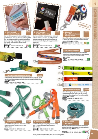 Due to possible currency fluctuations please call us for a firm quotation.79CONFERENCE & EVENTS9An ultra-smooth rPET lanyard personalised with a dye sublimation print on 1 or both sides. This soft material is created using recycled plastics and can be printed with vibrant and detailed full-colour artwork. MPA: 20 x 900mm5. Recycled PET Dye Sublimation LanyardPRICE: 100 - %u00a31.17 / 250 - %u00a31.00 / 500 - %u00a30.87E157905Size: 15mm Wide. Flat polyester lanyard. Standard metal swivel hook fitting. 42 standard colours available, please call for details. MPA: 12 x 800mm7. 15mm LanyardPRICE: 300 - %u00a30.84 / 500 - %u00a30.78 / 1000 - %u00a30.73E157907Recycled PET lanyards are produced from recycled drinks bottles making them eco-friendly. Supplied with a trigger clip and safety break as standard. Pantone matched. Choice of widths available. MPA: 13 x 900mm4. Recycled PET LanyardsPRICE: 100 - %u00a31.10 / 250 - %u00a30.97 / 500 - %u00a30.84E157904Made from recycled plastic. Chalkboard style, name window on the right. Use a chalk pen to write name - easy on/off (pen available to purchase separately). Logo printed CMYK as standard on the left.Prices shown are for safety pin, other fixing options available at different costs. MPA: 34 x 22mm2. 100% Recycled Chalkboard Name BadgePRICE: 10 - %u00a34.42 / 25 - %u00a33.81 / 50 - %u00a32.71E15790220mm x 900mm single layer slippery polyester lanyard with a dye sublimation print in four colour process to both sides. ATT-5 metal trigger clip and safety breakaway. 10mm, 15mm and 25mm available on request. MPA: 15 x 900mm6. Dye-sublimation LanyardPRICE: 100 - %u00a31.03 / 250 - %u00a30.89 / 500 - %u00a30.73E157906Size: 20mm. Wide flat polyester lanyard. Dog lever hook and safety break. 42 standard colours available, please call for details. MPA: 17 x 800mm8. 20mm LanyardPRICE: 300 - %u00a30.86 / 500 - %u00a30.80 / 1000 - %u00a30.75E157908White rPET lanyard with full colour dye sublimation design to one or both sides. Price includes trigger clip, safety break and dye sublimation both sides (same design). MPA: 900 x 20 mm9. Made In Britain rPET LanyardPRICE: 50 - %u00a31.77 / 100 - %u00a31.72 / 250 - %u00a31.67E15790920mm rPET Dye-sublimation Lanyard on our Express Service. Delivered in 5 working days. Full colour print on both sides with a safety break and trigger clip fitting. MPA: 20 x 300mm3. 20mm rPET Dye-sublimation Express Delivery LanyardPRICE: 100 - %u00a32.91 / 250 - %u00a31.67 / 500 - %u00a31.22E157903Made from 100% recycled plastic. Essential rectangle badges make a good first impression - all we need is the names and branding, it%u2019s that easy! Logo and details printed CMYK as standard. Attaching options (various cost per fitting): Safety pin, Magnet, Combo Clip: crocodile clip & safety pin. Prices shown are for the safety pin fitting. MPA: 73 x 35mm1. 100% Recycled Essential Name BadgePRICE: 10 - %u00a35.37 / 25 - %u00a34.46 / 50 - %u00a33.14E157901