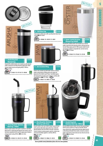 Due to possible currency fluctuations please call us for a firm quotation.41DRINKWARE5Heat resistant, sodalime glass coffee cup with printed silicone band and lid. MPA: 80 x 45mm2. Caf%u00e9 Glass CupPRICE: 50 - %u00a310.66 / 100 - %u00a39.29 / 250 - %u00a38.39 E154102Modern, recycled, stainless steel cup for use with hot or cold drinks. Made from RCS certified (Recycled Blended Claim) stainless steel. For hot drinks, simply flip the lid to reveal the sipping spout. Finished in premium powder coating. BPA free. MPA: 60 x 25mm5. Tahoe Recycled, Stainless Steel Cup - 590mlPRICE: 50 - %u00a313.58 / 100 - %u00a312.37 / 250 - %u00a311.83 E154105Oversized, 880ml recycled, stainless steel cup. Stay hydrated longer wth the Grande, insulated cup. Simply sip cold drinks with the straw or flip the lid for sipping warming hot drinks. Made from RCS certified (Recycled Blended Claim) stainless steel with an attractive powder coated exterior, chrome detail and clear, Tritan lid and straw. BPA free. MPA: 60 x 65mm7. Grande Recycled, Stainless Steel Cup - 880mlPRICE: 50 - %u00a315.30 / 100 - %u00a313.89 / 250 - %u00a313.34 E154107Recycled (RCS certified) stainless steel, insulated, cup with attractive powder coated finish and sliding leak-proof, sipping spout. 300ml capacity. Suitable for print and engraving. MOQ 25. BPA free. MPA: 60 x 40mm1. Arusha Recycled Thermal CupPRICE: 50 - %u00a313.05 / 100 - %u00a311.14 / 250 - %u00a310.30 E154101Stainless steel, insulated mug with handle. Finished in attractive powder coating keeping it looking good on the outside and piping hot on the inside for up to 4 hours. 12oz/350ml capacity with spill-proof lid and sipping spout. Supplied in a kraft box with compostable liner. MPA: 35 x 52mm4. Java Insulated MugPRICE: 50 - %u00a310.41 / 100 - %u00a39.07 / 250 - %u00a38.36 E154104Recycled, stainless steel, cup in modern design. Insulated to keep drinks perfectly chilled whilst sipping. Made from certified RCS (Recycled Blended Claim) 304 stainless steel with a crystal-clear Tritan lid. Finished in attractive powder coated for a modern look and increased durability. Supplied in a kraft box. BPA free. MPA: 150 x 35mm6. Kivu Recycled, Stainless Steel Cup with StrawPRICE: 50 - %u00a310.64 / 100 - %u00a39.66 / 250 - %u00a39.15 E154106Recycled (RCS certified) stainless steel insulated cup in attractive powder coated finish with contrasting stainless steel band and clear non-spill sliding sipping spout lid. 590ml capacity. Suitable for print and engraving. Supplied in compostable liner and kraft tuck box. MOQ 25. MPA: 30 x 50mm3. Oyster Jumbo Recycled Thermal Cup 590mlPRICE: 50 - %u00a312.64 / 100 - %u00a311.66 / 250 - %u00a311.04 E154103