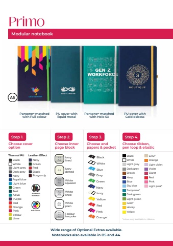 Modular notebookPU cover withliquid metalPU cover withGold debossPantone matchedwith Full colour%u00ae Pantone matchedwith Holo SX%u00aeChoose cover optionStep 1.WhitesquaredA5A4WhitelinedA5B51 colourbespoke your logoA5A4B5WhiteplainA5B5Ivorydotted A5A5A4IvorylinedChoose inner page blockStep 2.Choose ribbon, pen loop & elasticStep 4.Choose end papers & pocketStep 3.BlackWhiteBlueGreyGreenNavyIvoryYellowRedPinkOrange *colour only available in ribbonsWide range of Optional Extras available.Notebooks also available in B5 and A4.NavyBurgundyGreenRedBlackThermal PU Leather EffectLight greyDark greyNavyRoyal blueLight blueGreenBlackWhiteAquaPurpleRedTealOrangeYellowLimePinkBlackWhiteLight greyDark greyBrownNavyBlueSky blueTurquoise*Dark greenGold*HoneyYellowLight greenLight violetVioletClaretRedPinkLight pink*OrangeEcru*A5Full ColourPantoneMatched%u00ae